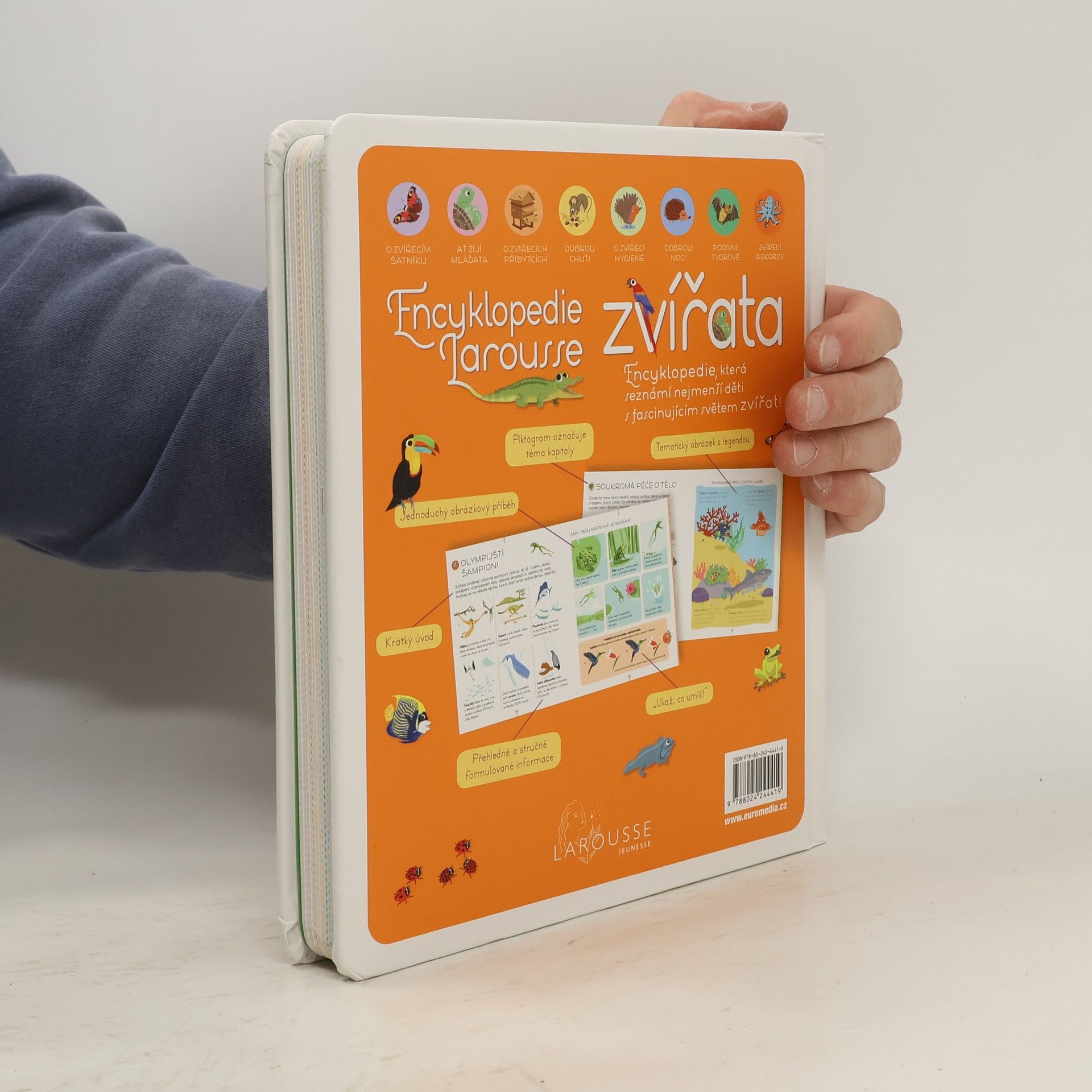 Encyklopedie pro nejmenší hravou a zábavnou formou seznamuje ty nejmenší s rozmanitostí světa zvířat. Tematicky rozčleněné kapitoly zahrnují vzhled rozmanitých živočichů, jejich zvyky, stravu, výchovu mláďat, výskyt i způsob života. Bohaté ilustrace a jednoduché obrázkové příběhy usnadňují dětem pochopení a knihu zpestřují mimo jiné zábavné úkoly a zajímavosti.