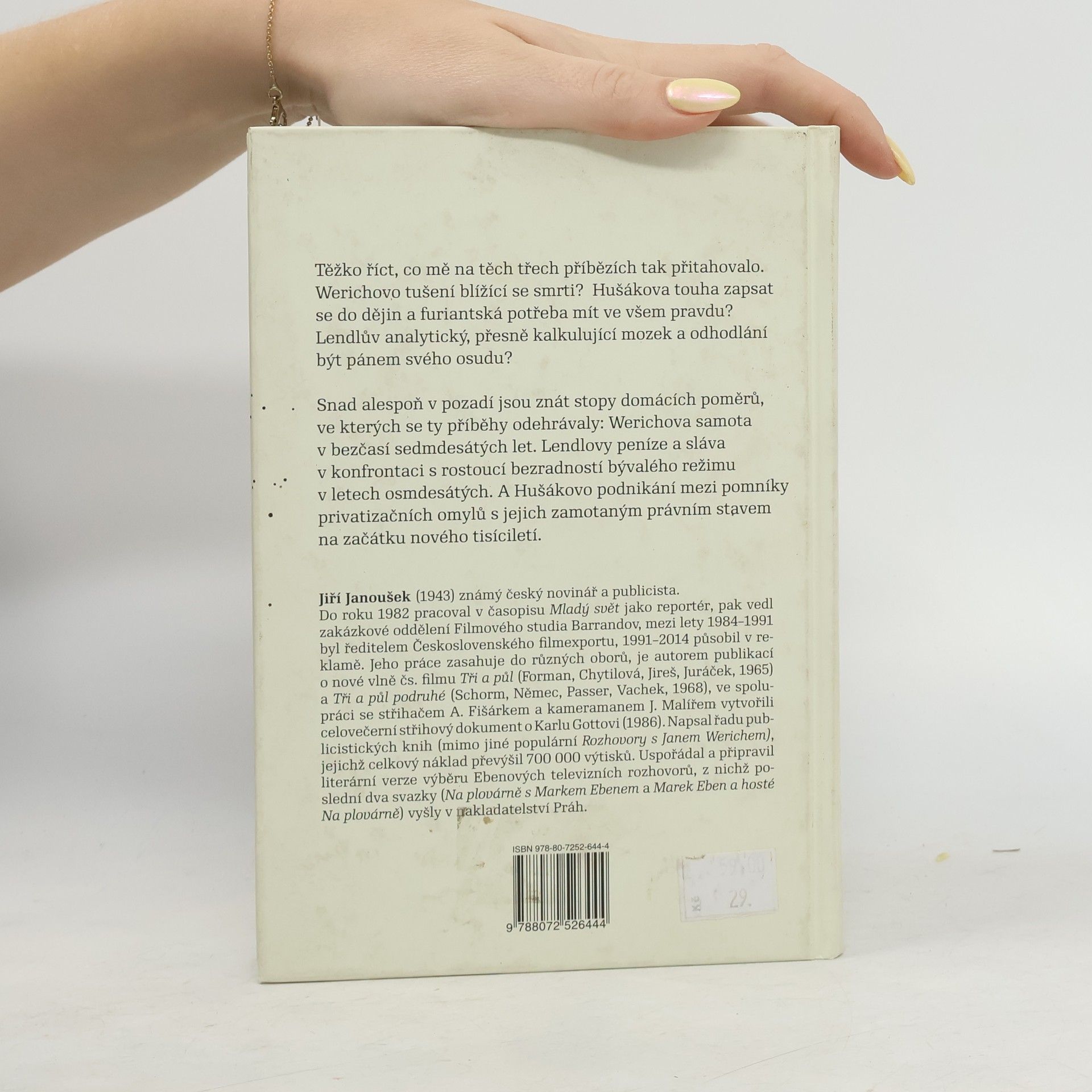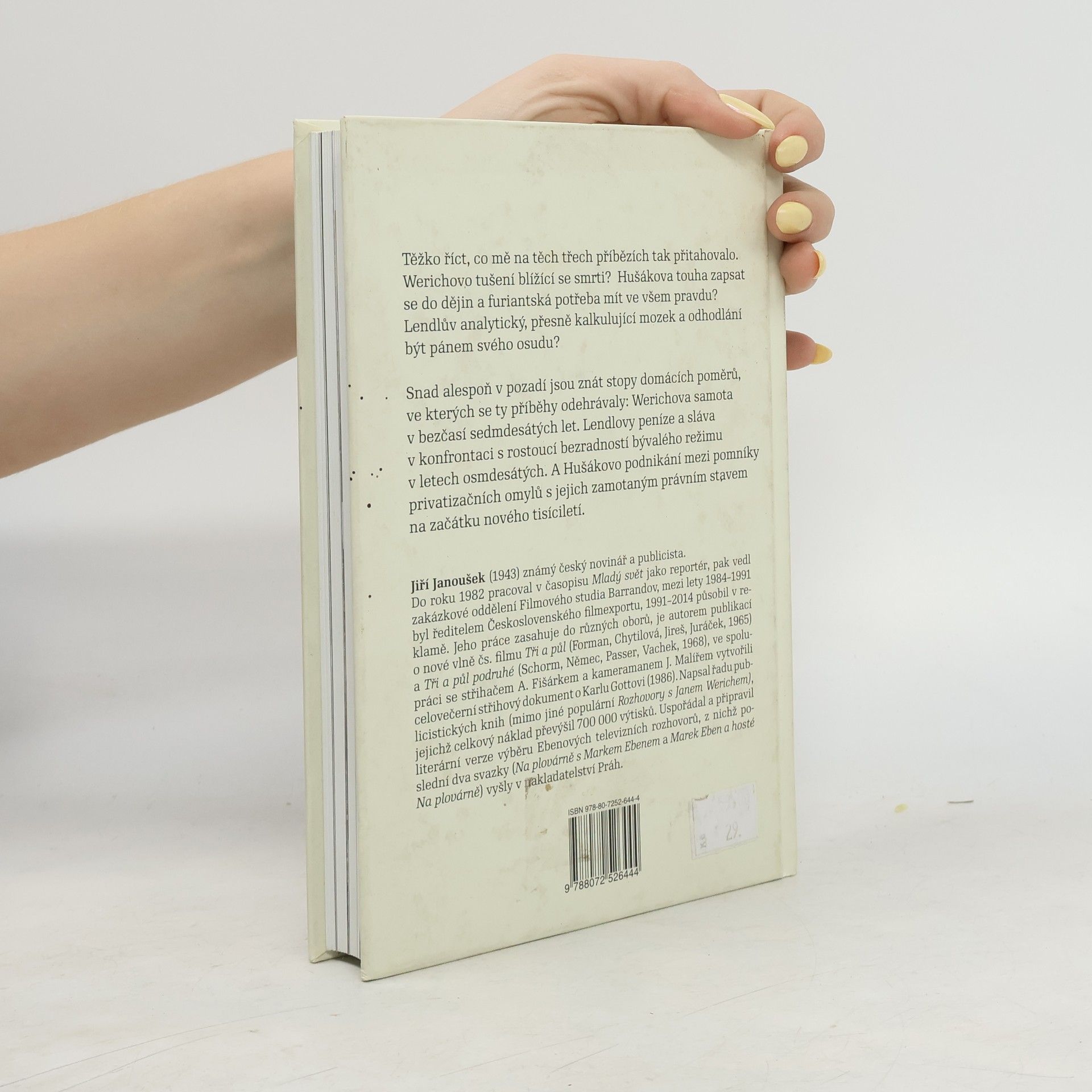 Tyto tři reportážní příběhy spojuje mistrovství vypravěče, známého publicisty Jiřího Janouška, mimo jiné také spoluautora knižních vydání rozhovorů NA PLOVÁRNĚ. Sám o této své knize říká: „Těžko říct, co mě na těch třech příbězích tak přitahovalo. Werichovo tušení blížící se smrti? Hušákova touha zapsat se do dějin a furiantská posedlost mít ve všem pravdu? Lendlův přesně kalkulující mozek, sebekázeň a odhodlání být pánem svého osudu? Snad alespoň v pozadí jsou znát stopy domácích poměrů, ve kterých se ty příběhy odehrávaly: Werichova samota v bezčasí sedmdesátých let. Lendlovy peníze a sláva, v konfrontaci s rostoucí bezradnosti bývalého režimu v letech osmdesátých. A Hušákovo podnikání mezi pomníky privatizačních omylů s jejich zamotaným právním stavem na začátku nového tisíciletí.“ Kniha obsahuje také originální fotografie z autorova archivu.