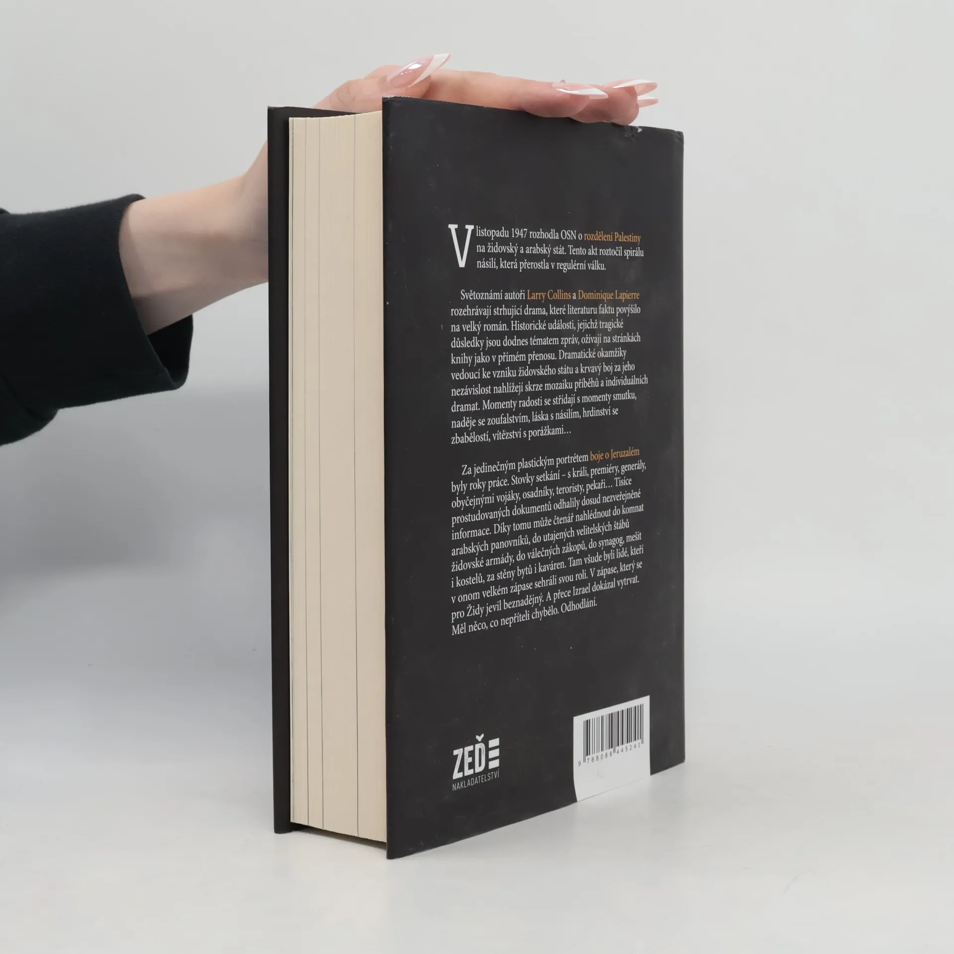 V listopadu 1947 rozhodla OSN o rozdělení Palestiny na židovský a arabský stát. Tento akt roztočil spirálu násilí, která přerostla v regulérní válku. Světoznámí autoři Larry Collins a Dominique Lapierre rozehrávají strhující drama, které literaturu faktu povýšilo na velký román. Historické události, jejichž tragické důsledky jsou dodnes tématem zpráv, ožívají na stránkách knihy jako v přímém přenosu. Dramatické okamžiky vedoucí ke vzniku židovského státu a krvavý boj za jeho nezávislost nahlížejí skrze mozaiku příběhů a individuálních dramat. Momenty radosti se střídají s momenty smutku, naděje se zoufalstvím, láska s násilím, hrdinství se zbabělostí, vítězství s porážkami… Za jedinečným plastickým portrétem boje o Jeruzalém byly roky práce. Stovky setkání – s králi, premiéry, generály, obyčejnými vojáky, osadníky, teroristy, pekaři… Tisíce prostudovaných dokumentů odhalily dosud nezveřejněné informace. Díky tomu může čtenář nahlédnout do komnat arabských panovníků, do utajených velitelských štábů židovské armády, do válečných zákopů, do synagóg, mešit i kostelů, za stěny bytů i kaváren. Tam všude byli lidé, kteří v onom velkém zápase sehráli svou roli. V zápase, který se pro Židy jevil beznadějný. A přece Izrael dokázal vytrvat. Měl něco, co nepříteli chybělo. Odhodlání.