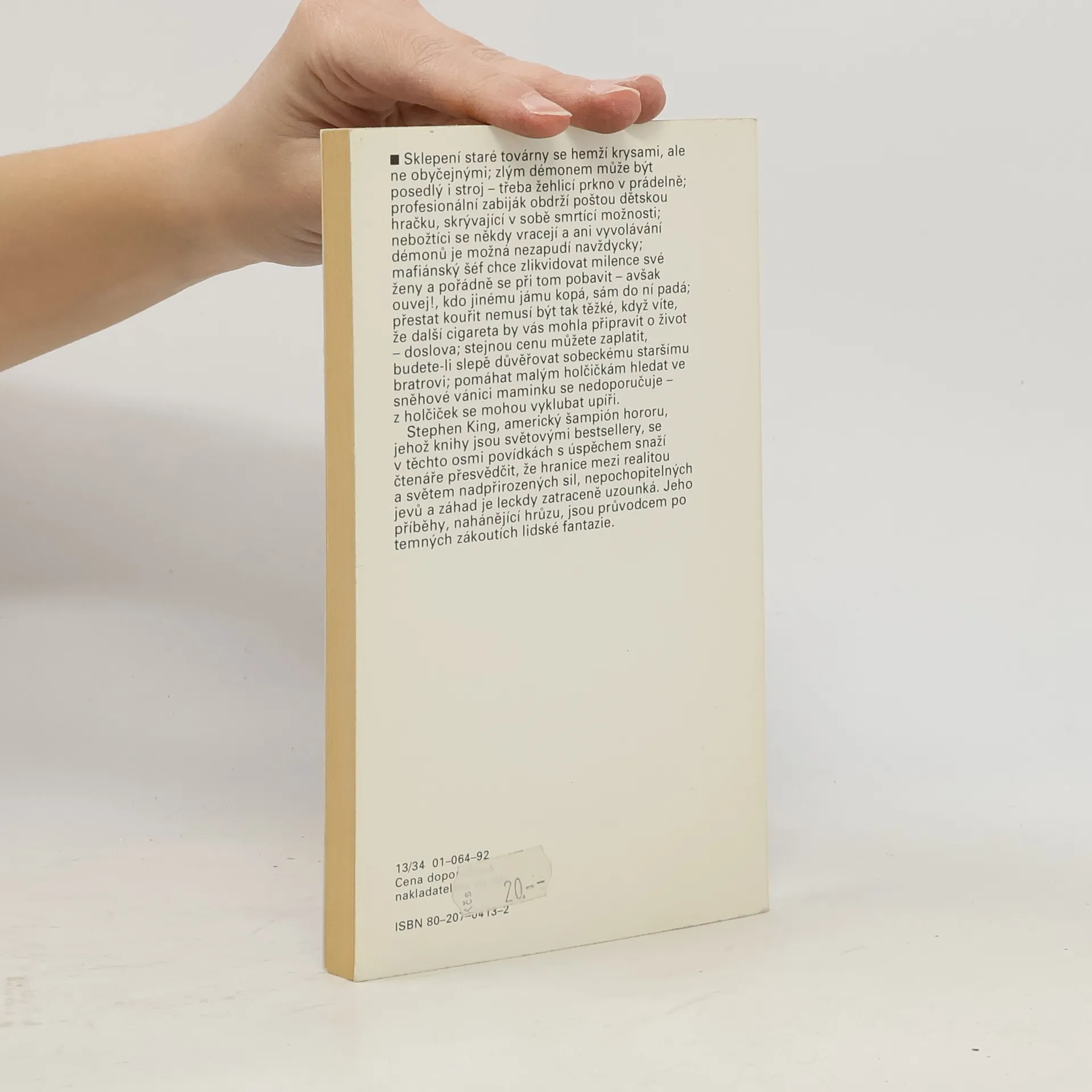 Sklepení staré továrny se hemží krysami, ale ne obyčejnými; zlým démonem může být posedlý i stroj – třeba žehlící prkno v prádelně; profesionální zabiják obdrží poštou dětskou hračku, skrývající v sobě smrtící možnosti; nebožtíci se někdy vracejí a ani vyvolávání démonů je možná nezapudí navždycky; mafiánský šéf chce zlikvidovat milence své ženy a pořádně se při tom pobavit – avšak ouvej!, kdo jinému jámu kopá, sám do ní padá; přestat kouřit nemusí být tak těžké, když víte, že další cigareta by vás mohla připravit o život – doslova; stejnou cenu můžete zaplatit, budete-li slepě důvěřovat sobeckému staršímu bratrovi; pomáhat malým holčičkám hledat ve sněhové vánici maminku se nedoporučuje. Stephen King, americký šampión moderního hororu, jehož knihy jsou světovými bestsellery, se v těchto osmi povídkách s úspěchem snaží čtenáře přesvědčit, že hranice mezi realitou a světem nadpřirozených sil, nepochopitelných jevů a záhad je leckdy zatraceně uzounká. Jeho příběhy, nahánějící hrůzu, jsou průvodce po temných zákoutí lidské fantazie. Přeložil Pavel Medek.