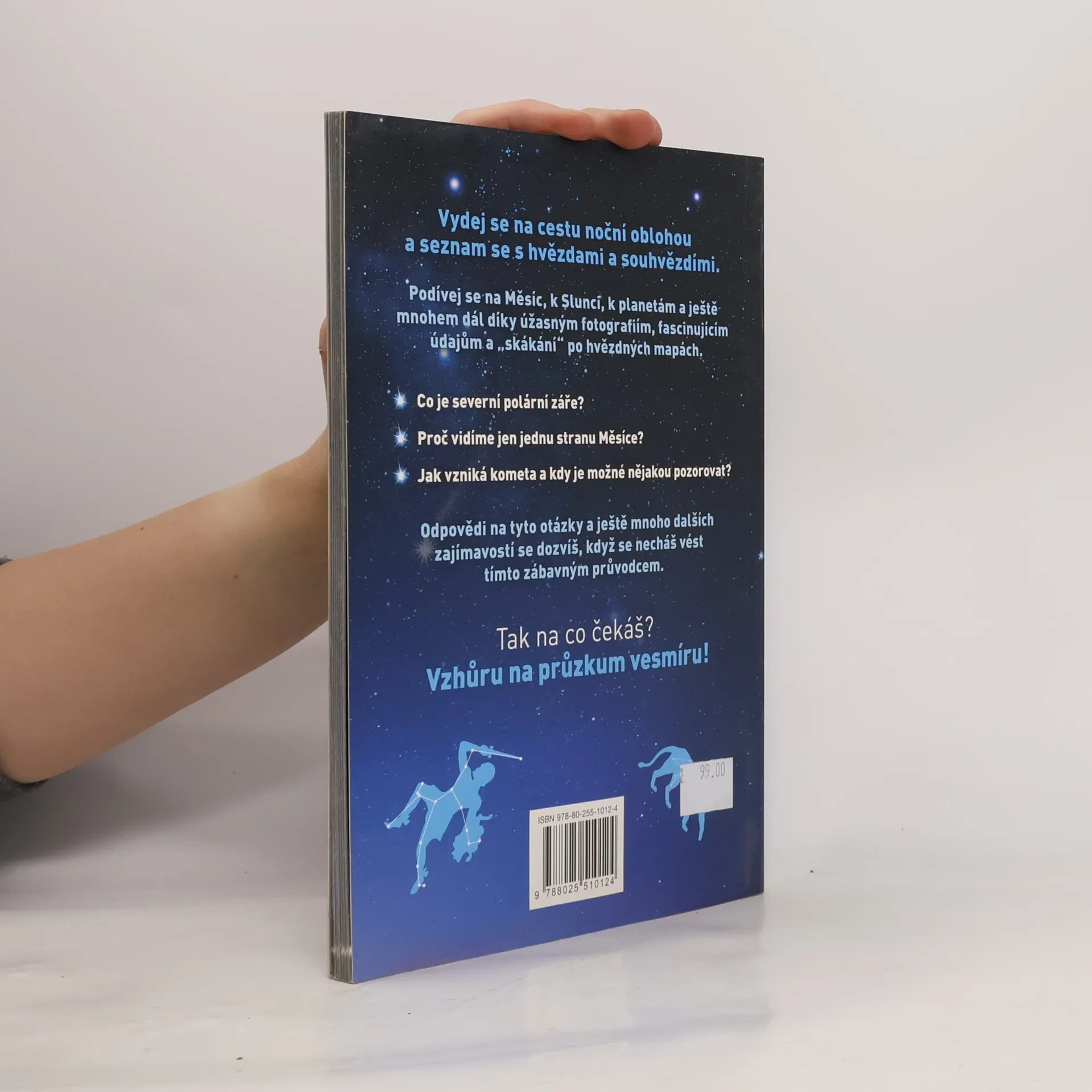 Vydej se na cestu noční oblohou a seznam se s hvězdami a souhvězdími. Podívej se na Měsíc, k Slunci, k planetám a ještě mnohem dál díky úžasným fotografiím, fascinujícím údajům a ,,skákání'' po hvězdných mapách. *co je severní polární záře? *proč vidíme jen jednu stranu Měsíce? *jak vzniká kometa a kdy je možné nějakou pozorovat? Odpovědi na tyto otázky a ještě mnoho dalších zajímavostí se dozvíš , když se necháš vést tímto zábavným průvodcem. TAK NA CO ČEKÁŠ ? Vzhůru na průzkum vesmíru !
