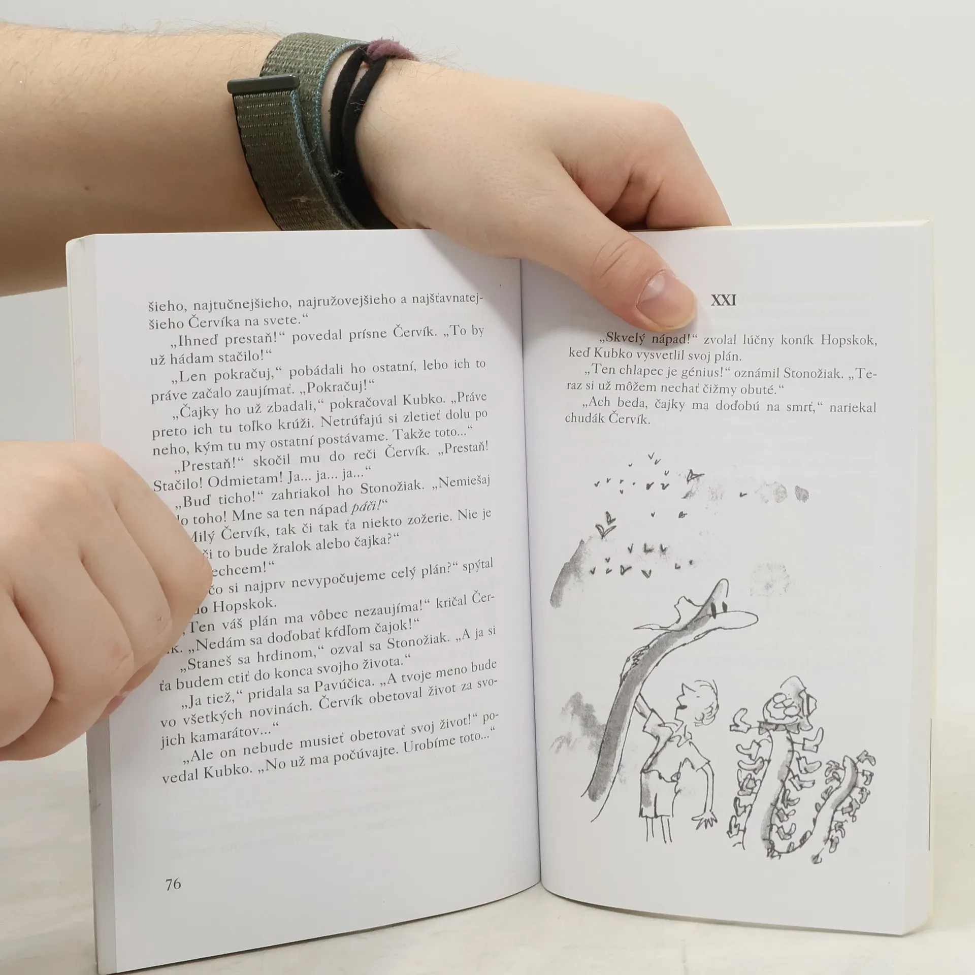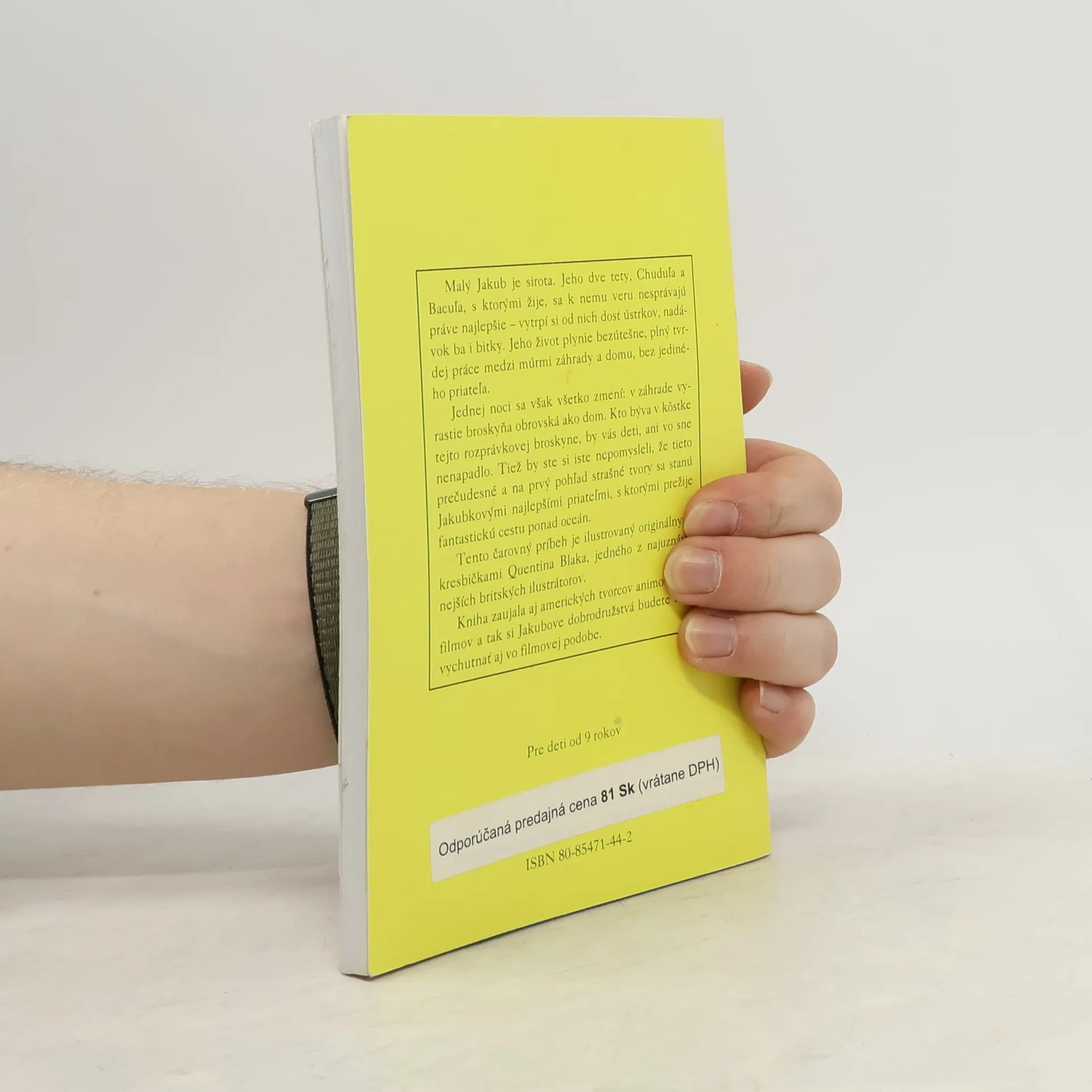 Malý Jakub je sirota. Jeho dve tety, Chuduľa a Bacuľa, s ktorými žije, sa k nemu veru nesprávajú práve najlepšie - vytrpí si od nich dosť ústrkov, nadávok ba i bitky. Jeho život plynie bezútešne, plný tvrdej práce medzi múrmi záhrady a domu, bez jediného priateľa. Jednej noci sa však všetko zmení: v záhrade vyrastie broskyňa obrovská ako dom. Kto býva v kôstke tejto rozprávkovej broskyne, by vás deti, ani vo sne nenapadlo. Tiež by ste si iste nepomysleli, že tieto prečudesné a na prvý pohľad strašné tvory sa stanú Jakubkovými najlepšími priateľmi, s ktorými prežije fantastickú cestu ponad oceán. Tento čarovný príbeh je ilustrovaný originálnymi kresbičkami Quentina Blaka, jedného z najuznávanejších britských ilustrátorov.