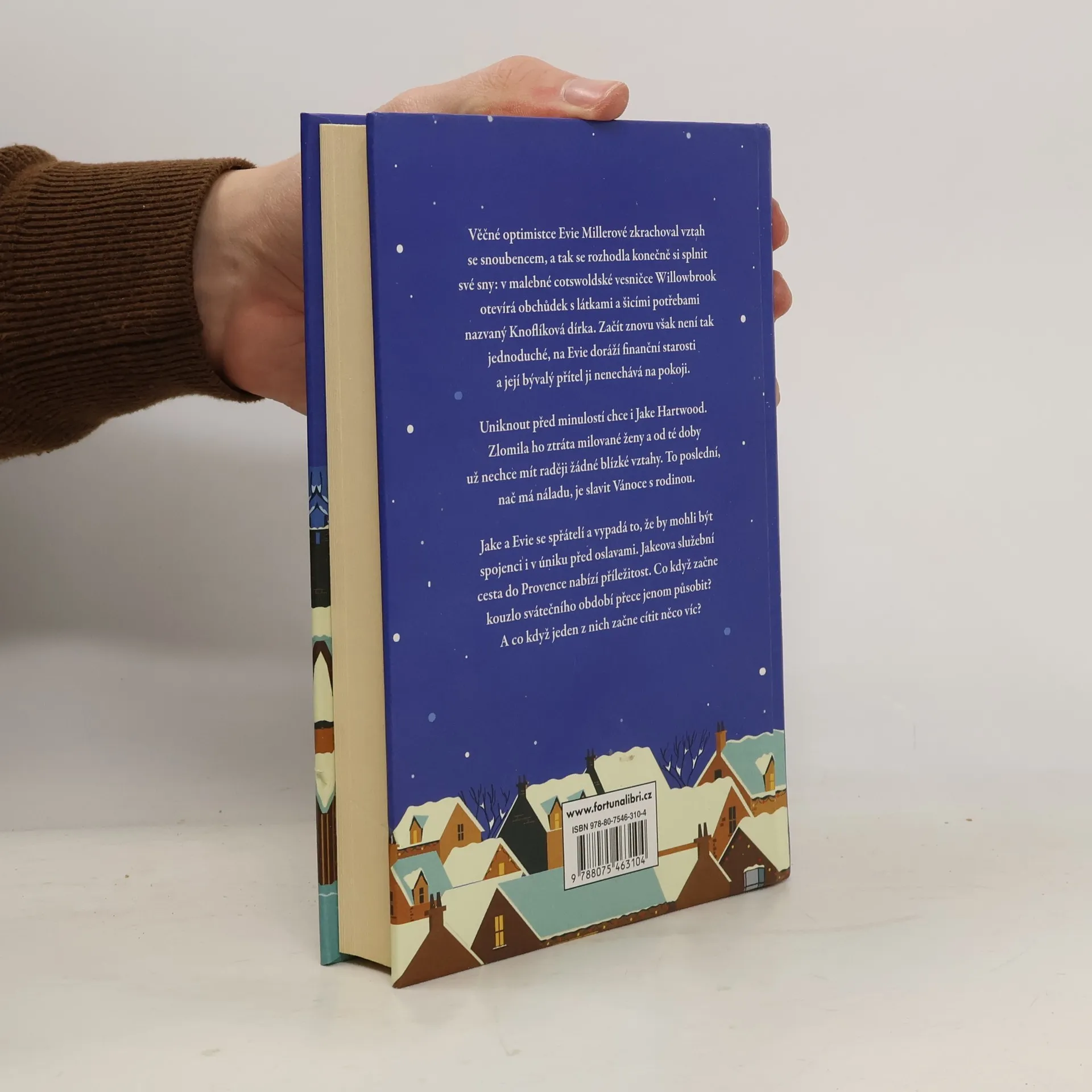 Věčné optimistce Evie Millerové zkrachoval vztah se snoubencem, a tak se rozhodla konečně si splnit své sny: v malebné cotswoldské vesničce Willowbrook otevírá obchůdek s látkami a šicími potřebami nazvaný Knoflíková dírka. Začít znovu však není tak jednoduché, na Evie doráží finanční starosti a její bývalý ji nenechává na pokoji. Uniknout před minulostí chce i Jake Hartwood. Zlomila ho ztráta milované ženy a od té doby už nechce mít raději žádné blízké vztahy. To poslední, nač má náladu, je slavit Vánoce s rodinou. Jake a Evie se spřátelí a vypadá to, že by mohli být spojenci i v úniku před oslavami. Jakeova služební cesta do Provence nabízí příležitost. Co když však kouzlo svátečního období začne přece působit? A co když jeden z nich začne cítit něco víc?