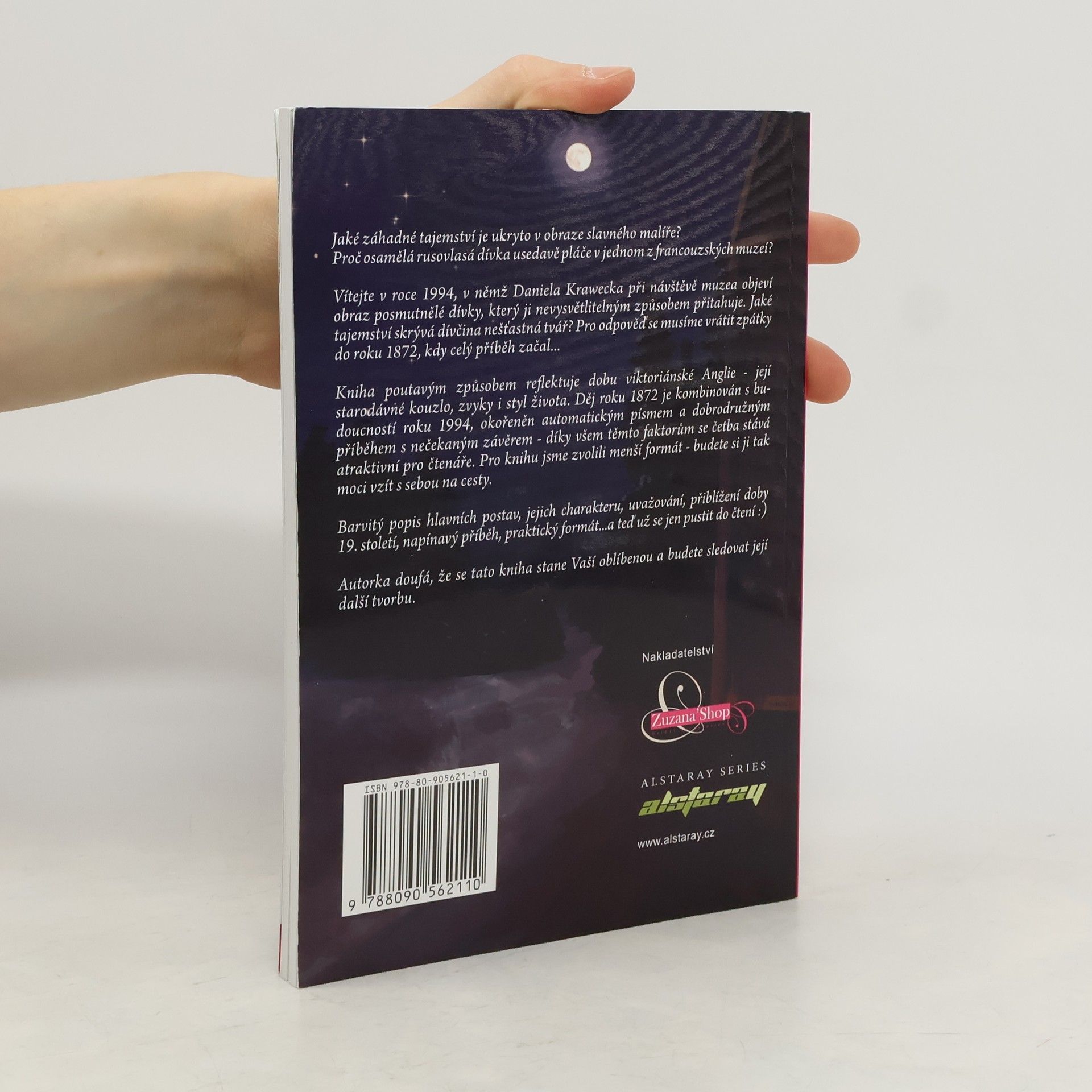 Jaké záhadné tajemství je ukryto v obraze slavného malíře? Proč osamělá rusovlasá dívka usedavě pláče v jednom z francouzských muzeí? Vítejte v roce 1994, v němž Daniela Krawecka při návštěvě muzea objeví obraz posmutnělé dívky, který ji nevysvětlitelným způsobem přitahuje. Jaké tajemství skrývá dívčina nešťastná tvář? Pro odpověď se musíme vrátit zpátky do roku 1872, kdy celý příběh začal... Kniha poutavým způsobem reflektuje dobu viktoriánské Anglie - její starodávné kouzlo, zvyky i styl života. Děj roku 1872 je kombinován s budoucností roku 1994, okořeněn automatickým písmem a dobrodružným příběhem s nečekaným závěrem - díky všem těmto faktorům se četba stává atraktivní pro čtenáře. Pro knihu jsme zvolili menší formát - budete si ji tak moci vzít s sebou na cesty. Barvitý popis hlavních postav, jejich charakteru, uvažování a popisu doby 19. století, napínavý příběh, praktický formát...a teď už se jen pustit do čtení :)