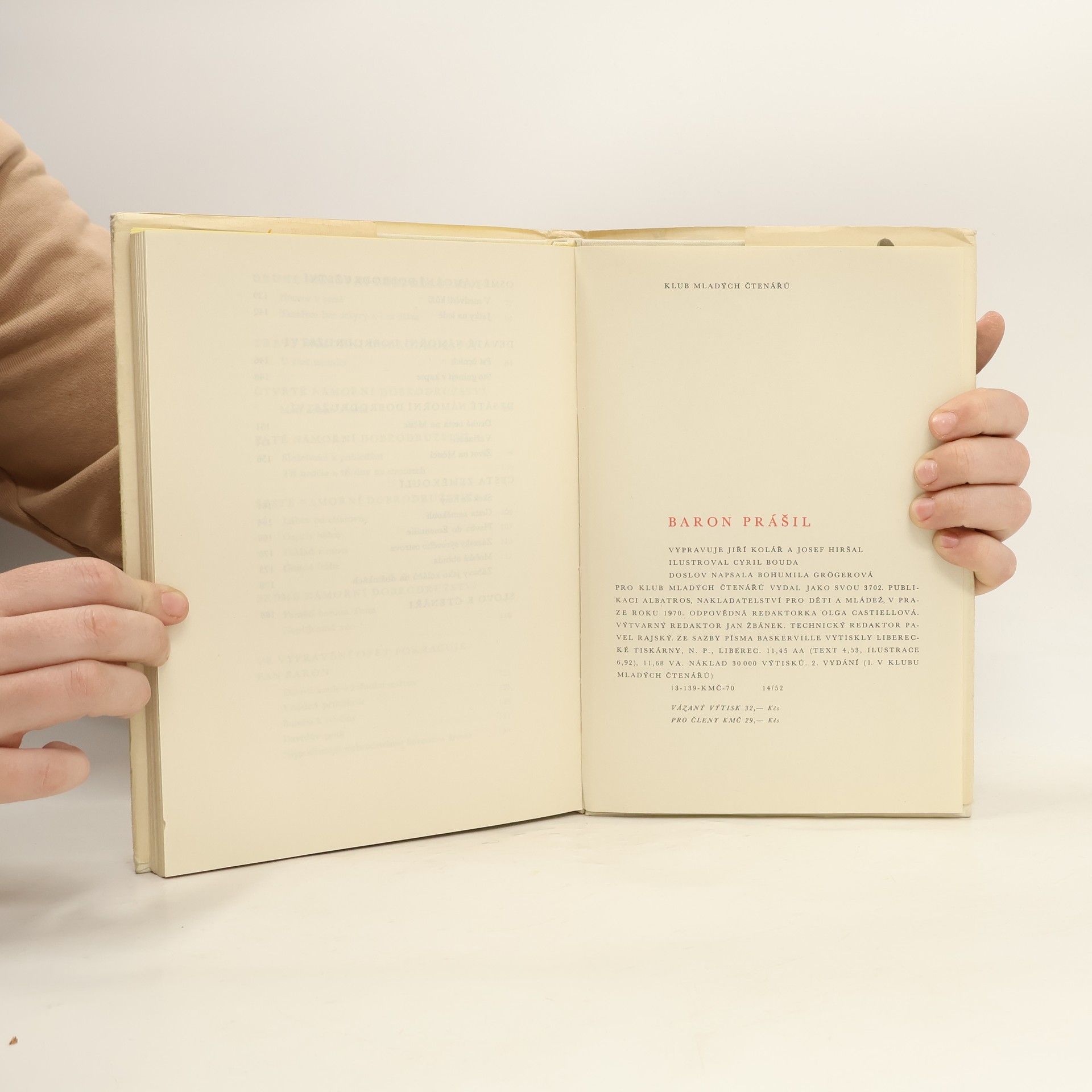 Baron Prášil: o strachu i udatenství, o přízni i protivenství, o lovu i cestování, o boji i hodování, řada příhod, jimiž strašil nebojácné. Převyprávění slavné knihy o ještě slavnějším baronovi a jeho příhodách. Podle Gottfrieda Augusta Bürgera zpracovali Jiří Kolář a Josef Hiršal, doslov napsala Bohumila Grögerová.