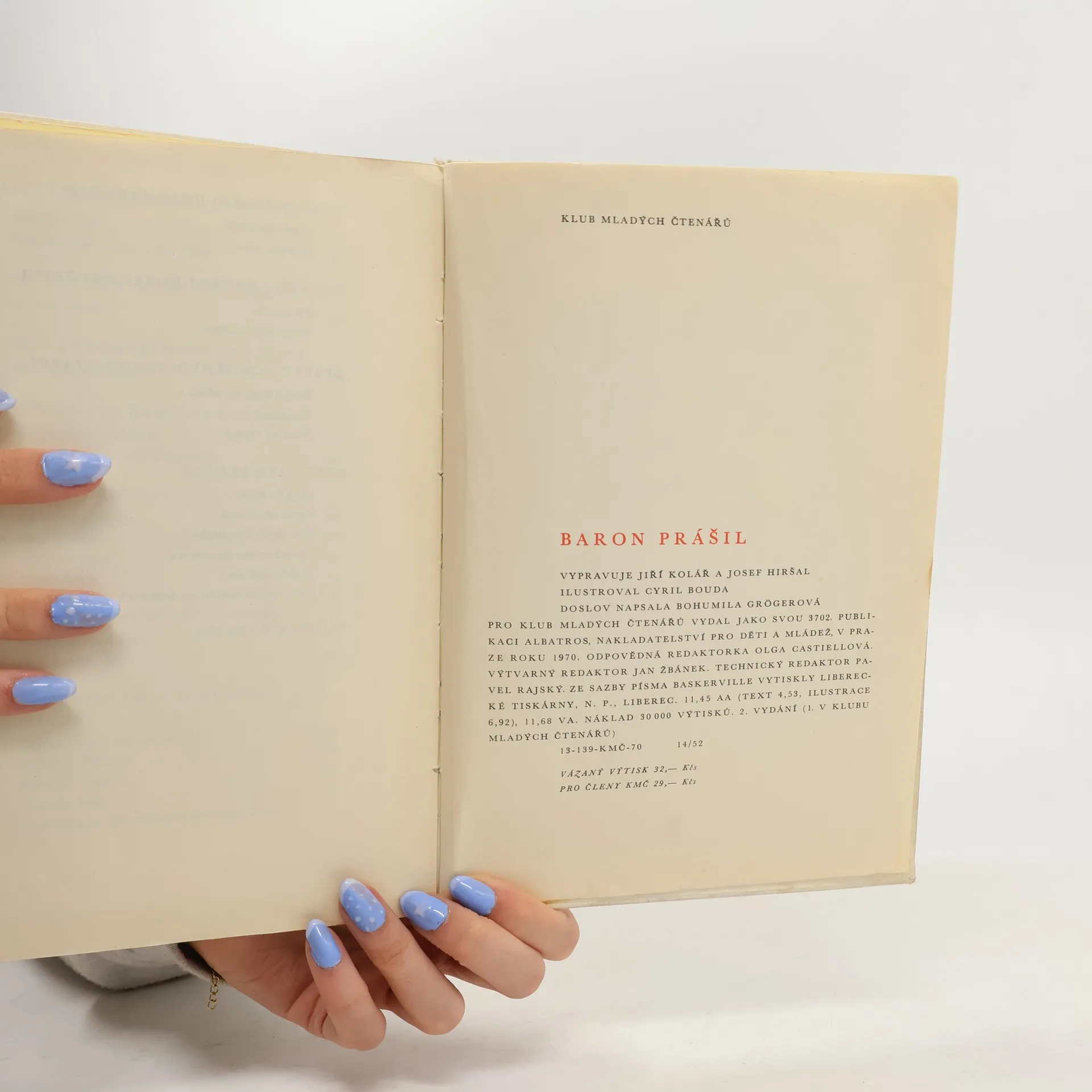 Baron Prášil: o strachu i udatenství, o přízni i protivenství, o lovu i cestování, o boji i hodování, řada příhod, jimiž strašil nebojácné. Převyprávění slavné knihy o ještě slavnějším baronovi a jeho příhodách. Podle Gottfrieda Augusta Bürgera zpracovali Jiří Kolář a Josef Hiršal, doslov napsala Bohumila Grögerová.