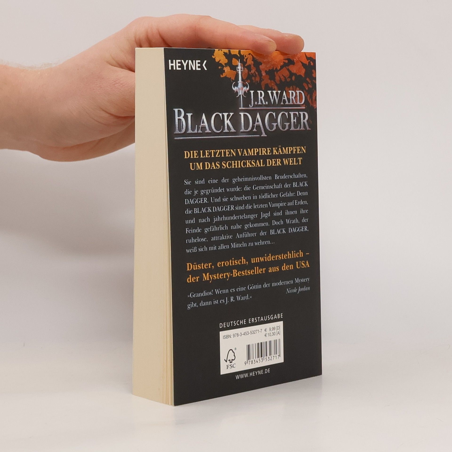 Düster, erotisch, unwiderstehlich – die letzten Vampire kämpfen um das Schicksal der Welt Das Leben der jungen Beth Randall verläuft eigentlich in ruhigen Bahnen – sie lebt in einem zu kleinen Apartment, geht selten aus und hat einen schlecht bezahlten Reporterjob bei einer kleinen Zeitung in Caldwell, New York. Ihr Job ist es auch, der sie an den Tatort eines ungewöhnlichen Mordes führt: Vor einem Club ist ein Mann bei der Explosion einer Autobombe gestorben, und die Polizei kann keinen Hinweis auf die wahre Identität des Toten finden. Dann trifft Beth auf den geheimnisvollen Wrath, der in Zusammenhang mit dem Mord zu stehen scheint. Der attraktive Fremde übt eine unheimliche Anziehung auf sie aus, der sie sich nicht entziehen kann. Während sie sich auf eine leidenschaftliche Affäre mit Wrath einlässt, wächst in ihr der Verdacht, dass er der gesuchte Mörder ist. Und Wrath hat noch ein paar Überraschungen mehr für sie auf Lager, denn er behauptet, ein Vampir zu sein – und das Oberhaupt der Bruderschaft der BLACK DAGGER, die seit Jahrhunderten einen gnadenlosen Krieg um das Schicksal der Welt führen muss ….