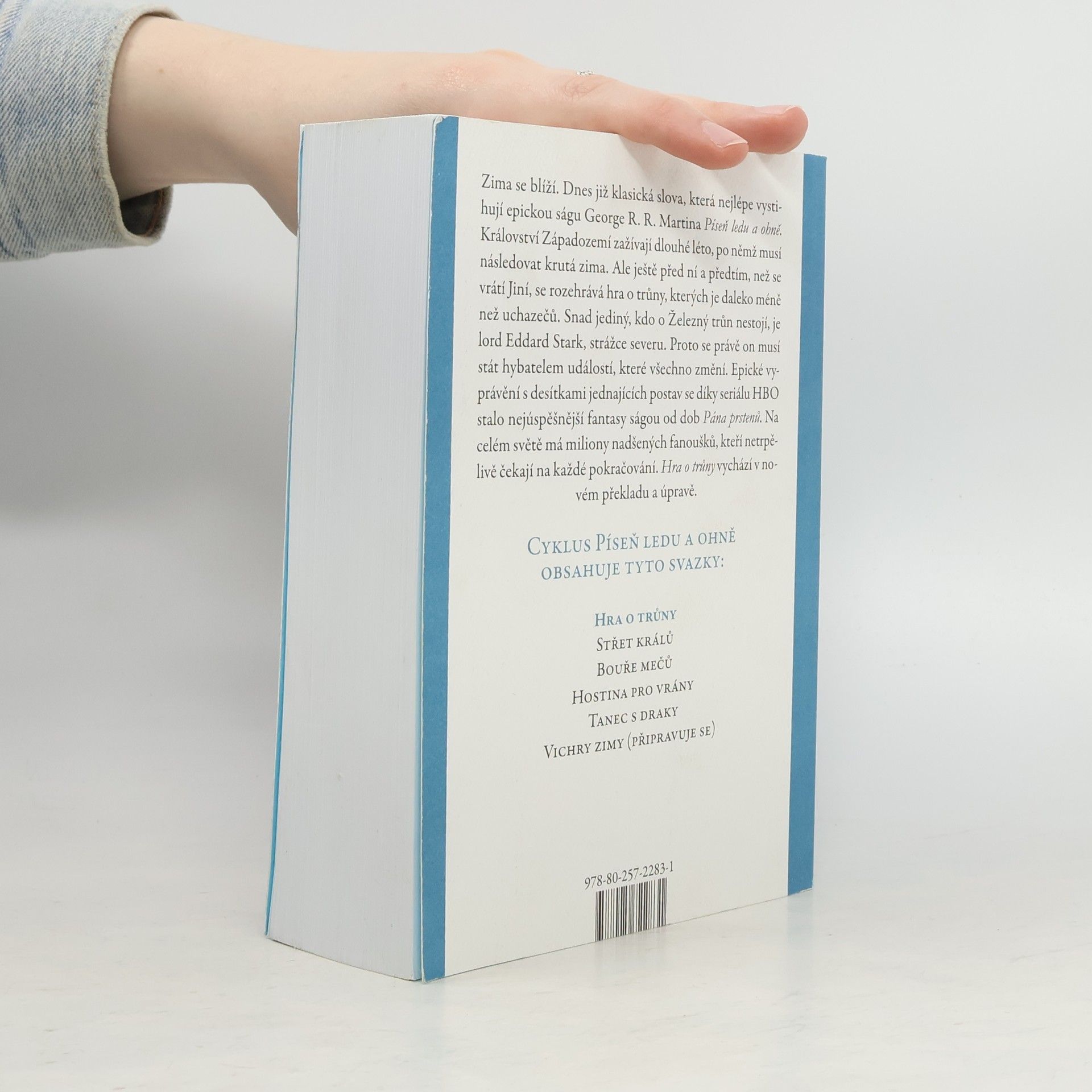 Zima se blíží. Dnes již klasická slova, která nejlépe vystihují epickou ságu George R. R. Martina Píseň ledu a ohně. Království Západozemí zažívají dlouhé léto, po němž musí následovat krutá zima. Ale ještě před ní a předtím, než se vrátí Jiní, se rozehrává hra o trůny, kterých je daleko méně než uchazečů. Snad jediný, kdo o Železný trůn nestojí, je lord Eddard Stark, strážce severu. Proto se právě on musí stát hybatelem událostí, které všechno změní. Epické vyprávění s desítkami postav se díky seriálu HBO stalo nejúspěšnější fantasy ságou od dob Pána prstenů. Na celém světě má miliony nadšených fanoušků, kteří netrpělivě čekají na každé pokračování. Hra o trůny vychází česky v novém překladu a úpravě.