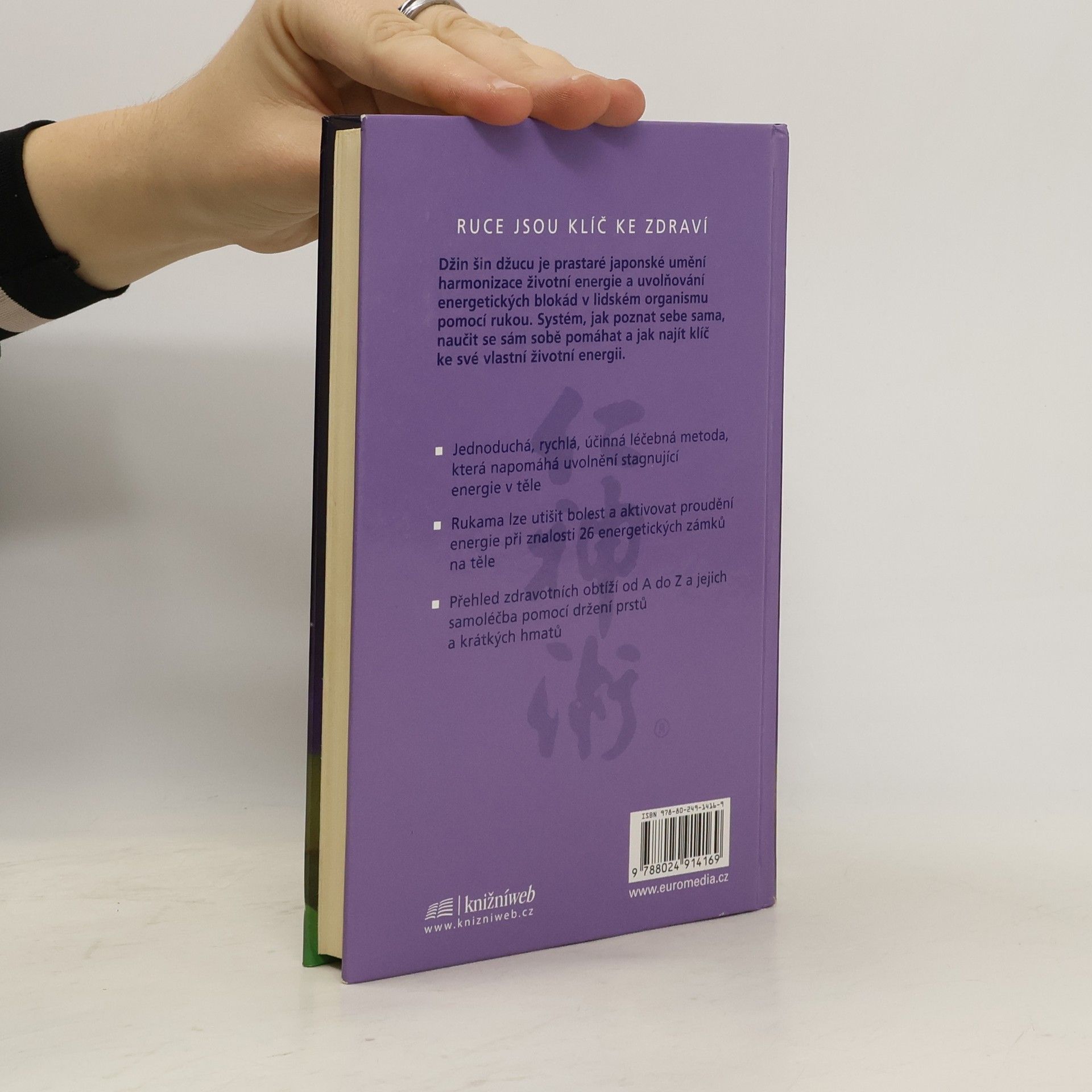 Džin šin džucu je prastaré japonské umění harmonizace životní energie a uvolňování energetických blokád v lidském organismu pomocí rukou. Jednoduchá, rychlá a účinná samoléčebná metoda, při níž se používá držení prstů a krátké hmaty, dokáže utišit bolest. Kniha obsahuje přehled zdravotních obtíží od A do Z a možnost jejich samoléčby – alergie, bolesti hlav, zad, křeče, pálení žáhy, revma, ploténky a další.