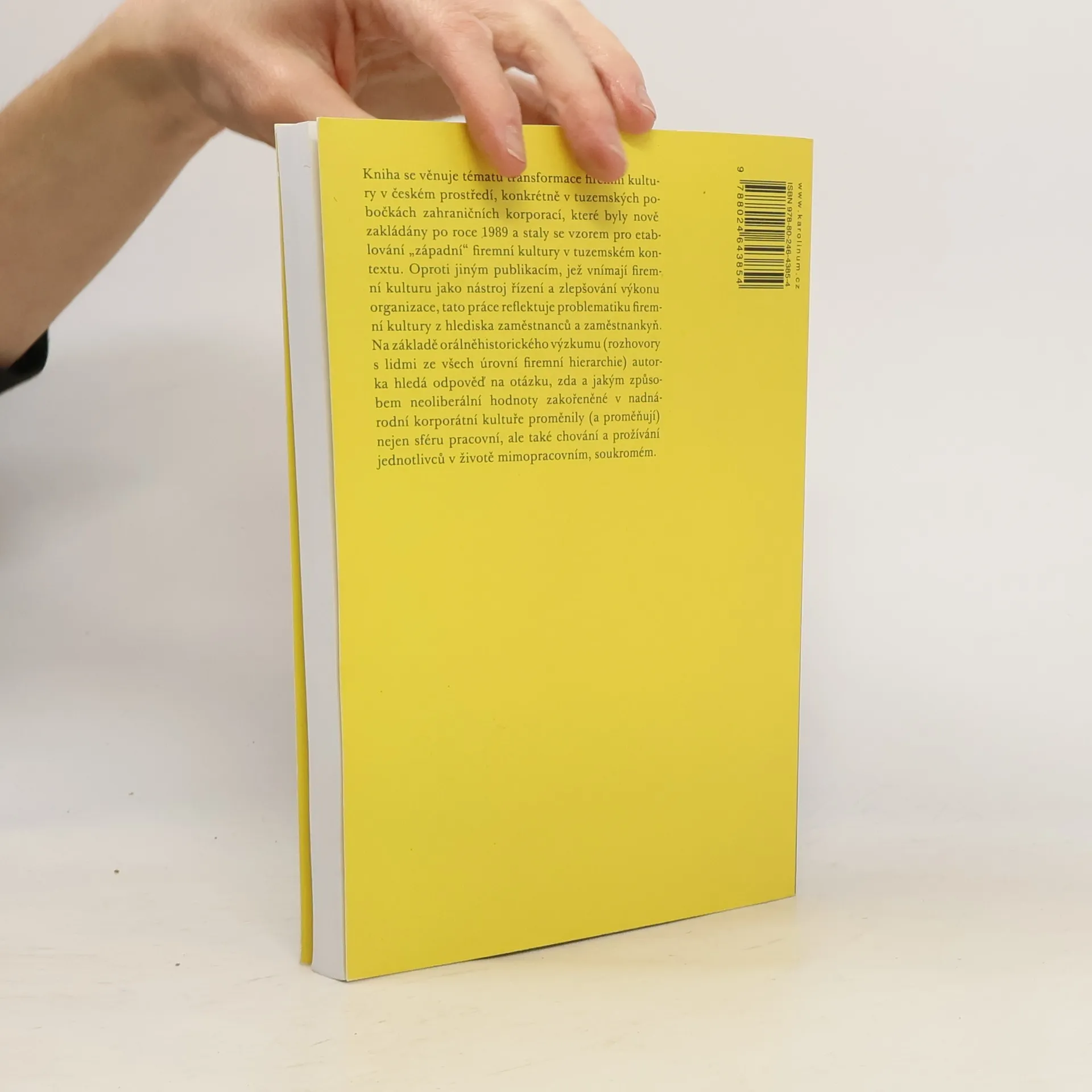 Kniha se věnuje tématu transformace firemní kultury v českém prostředí, konkrétně v tuzemských pobočkách zahraničních korporací, jež byly nově zakládány po roce 1989 a staly se vzorem pro etablování „západní“ firemní kultury v tuzemském kontextu. Oproti jiným publikacím, jež vnímají firemní kulturu jako nástroj řízení a zlepšování výkonu organizace, tato práce reflektuje problematiku firemní kultury z hlediska zaměstnanců a zaměstnankyň. Na základě orálněhistorického výzkumu (rozhovory s lidmi ze všech úrovní firemní hierarchie) autorka hledá odpověď na otázku, zda a jakým způsobem neoliberální hodnoty zakořeněné v nadnárodní korporátní kultuře proměnily (a proměňují) nejen sféru pracovní, ale také chování a prožívání jednotlivců v životě mimopracovním, soukromém.