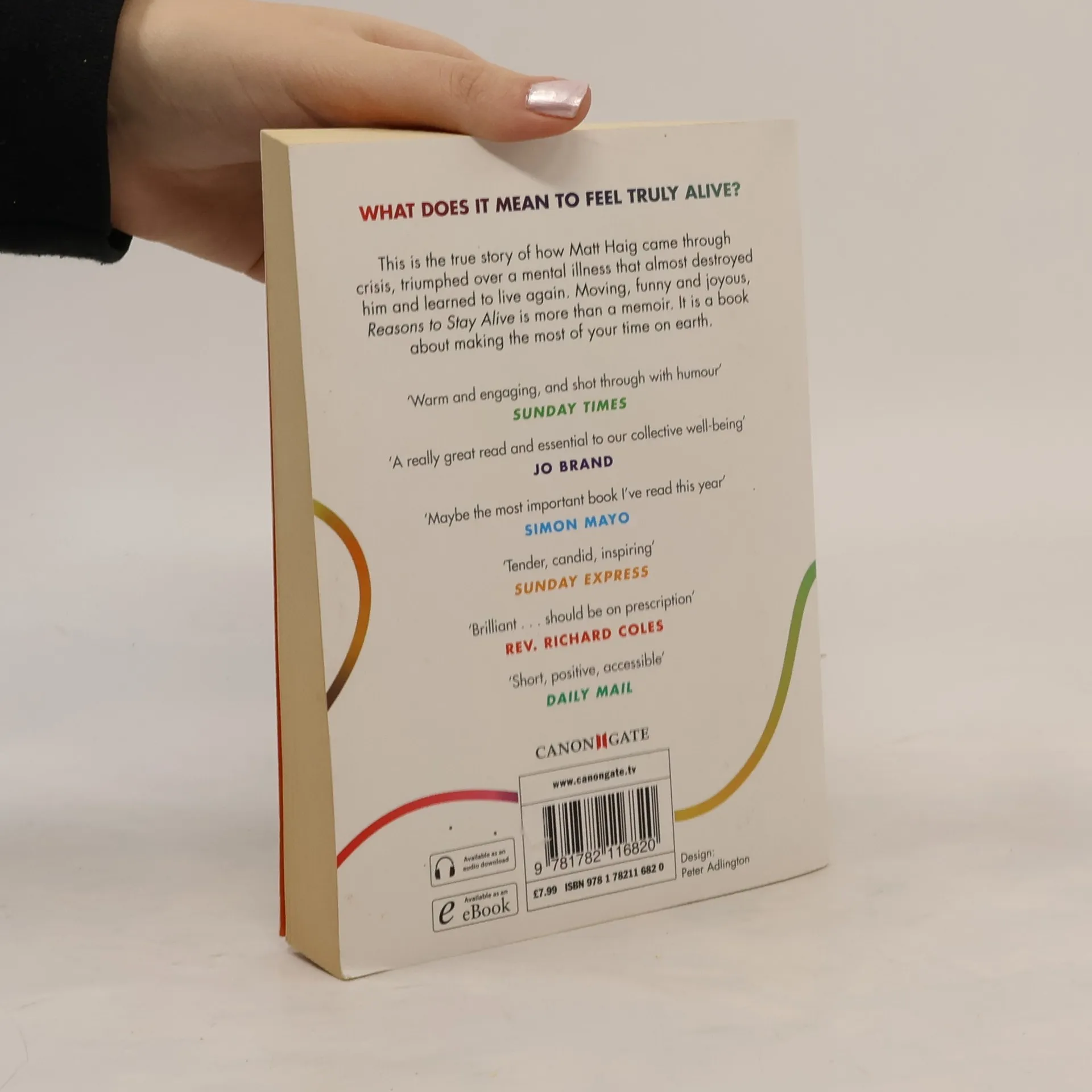 WHAT DOES IT MEAN TO FEEL TRULY ALIVE? Aged 24, Matt Haig's world caved in. He could see no way to go on living. This is the true story of how he came through crisis, triumphed over an illness that almost destroyed him and learned to live again.A moving, funny and joyous exploration of how to live better, love better and feel more alive, Reasons to Stay Alive is more than a memoir. It is a book about making the most of your time on earth."I wrote this book because the oldest clichés remain the truest. Time heals. The bottom of the valley never provides the clearest view. The tunnel does have light at the end of it, even if we haven't been able to see it . . . Words, just sometimes, really can set you free."