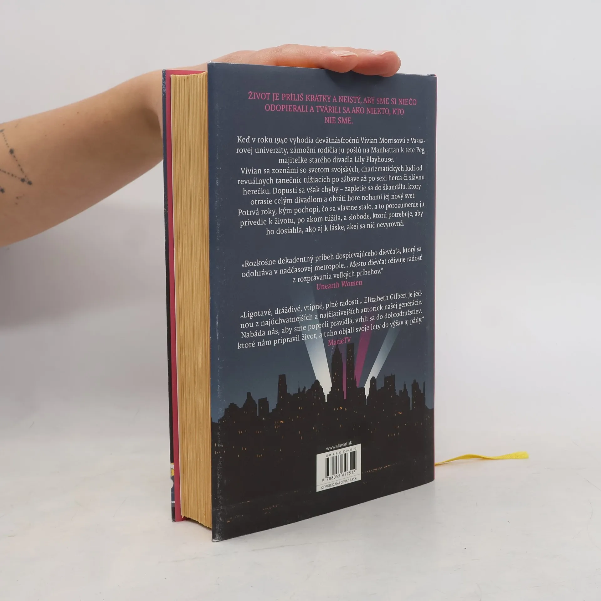 Nemusíme žiť nudne ako slušné dievčatá, aby sa z nás stali dobrí ľudia. Nový román autorky bestsellerov Podstata všetkých vecí a Jedz, modli sa a miluj. Elizabeth Gilbert sa vracia s podmanivým ľúbostným príbehom zo vzrušujúceho sveta newyorských divadiel v štyridsiatych rokoch 20 storočia. Keď devätnásťročnú Vivian Morrisovú vyhodia z Vassarovej univerzity za slabý výkon v prvom ročníku, zámožní rodičia ju pošlú na Manhattan k tete Peggy, majiteľke spustnutého divadla Lily Playhouse. Vivian sa u tety zoznámi so svetom nekonvenčných a charizmatických ľudí, od revuálnych tanečníc, ktoré snívajú iba o zábave, až po sexi herca či prestížnu herečku. Dievča sa však dopustí chyby, ktorá vyvolá profesionálny škandál a obráti jej krásny nový svet naruby.