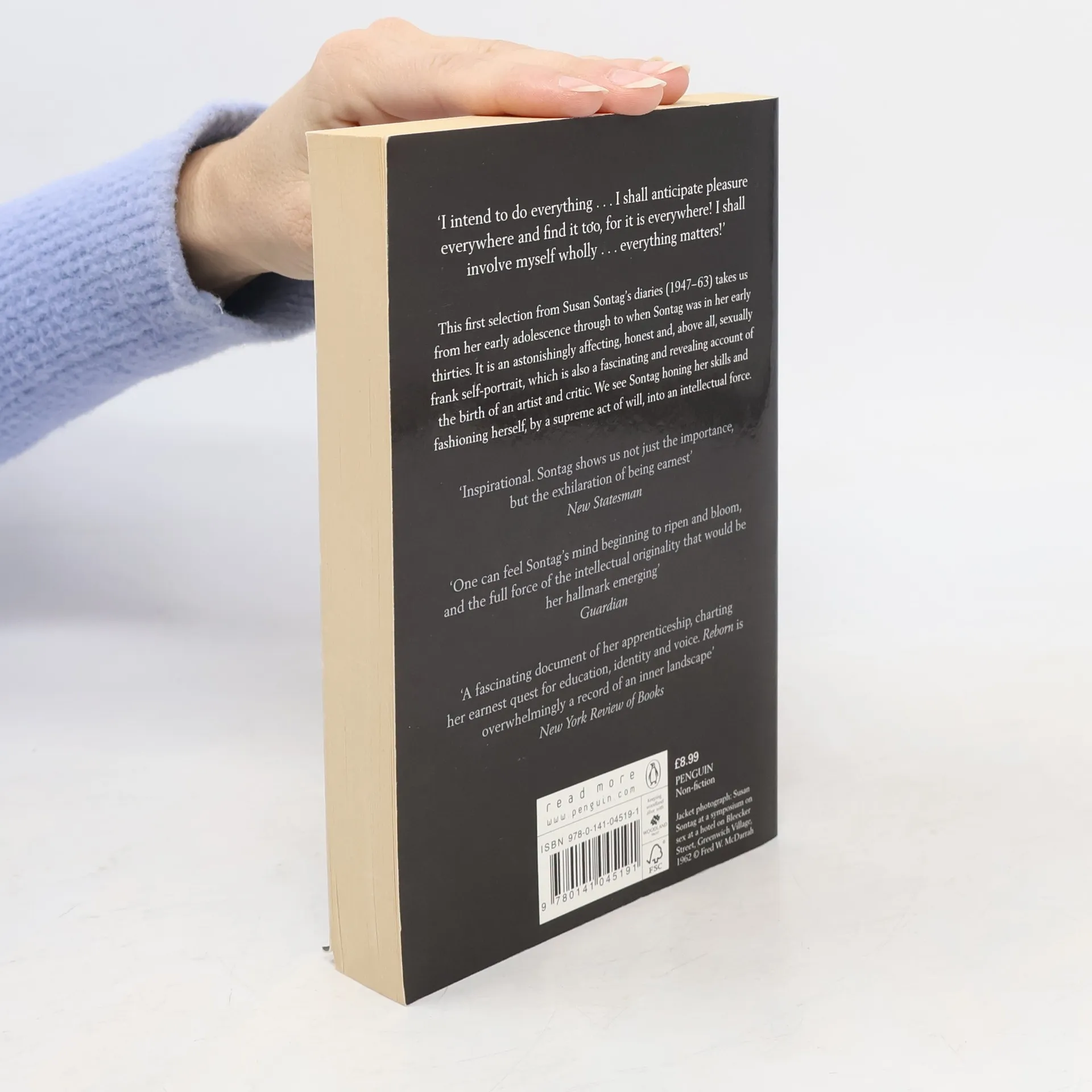 'I intend to do everything . . . I shall anticipate pleasure everywhere and find it too, for it is everywhere! I shall involve myself wholly . . . everything matters!' This first selection from Susan Sontag's diaries (from 1947 - 1963) takes us from early adolescence though to when Sontag was in her early thirties. It is an astonishingly affecting and honest self-portrait which is also a fascinating, revealing account of an artist and critic being born. We see Sontag honing her skills and fashioning herself, by a supreme act of will, into an intellectual force. 'Inspirational. Sontag shows us not just the importance, but the exhilaration of being earnest' New Statesman 'One can feel Sontag's mind beginning to ripen and bloom, and the full force of the intellectual originality that would be her hallmark emerging' Guardian 'A fascinating document of her apprenticeship, charting her earnest quest for education, identity and voice. Reborn is overwhelmingly a record of an inner landscape' New York Review of Books