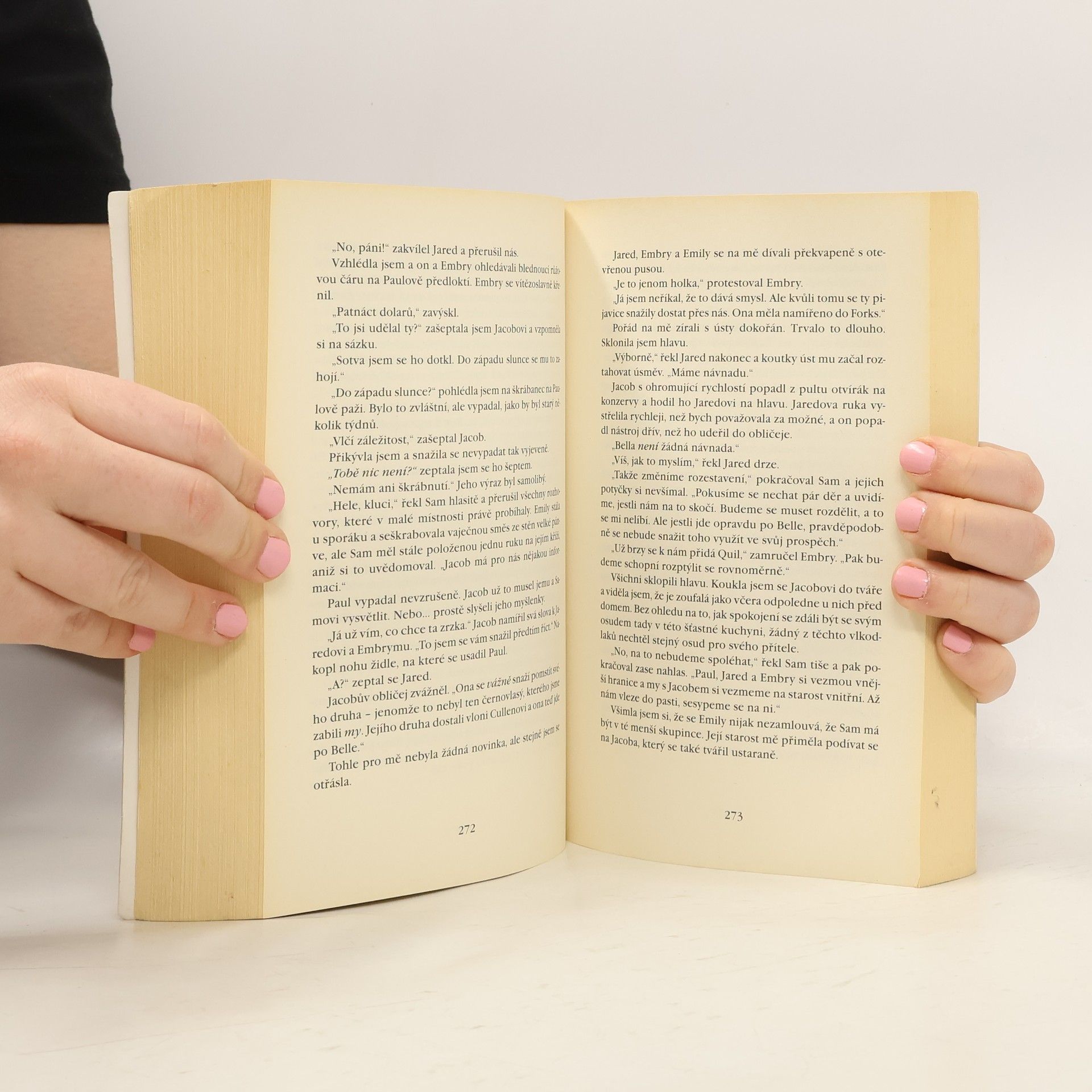 Musím říct, že mé nadšení z prvního dílu se naprosto nedá vyrovnat dílu druhému. Je to něco naprosto odlišného. Hodně mi tu chybí postava Edwarda Cullena, protože hlavně díky němu jsou ty knihy a příběh samotný, tak zajímavý, je to kontrast zlo x dobro. V téhle knize se objevuje většinou pouze Bella a Jacob, což je pro mě jako dobro x dobro, proto jsem se při čtení druhého dílu hodně nudila.