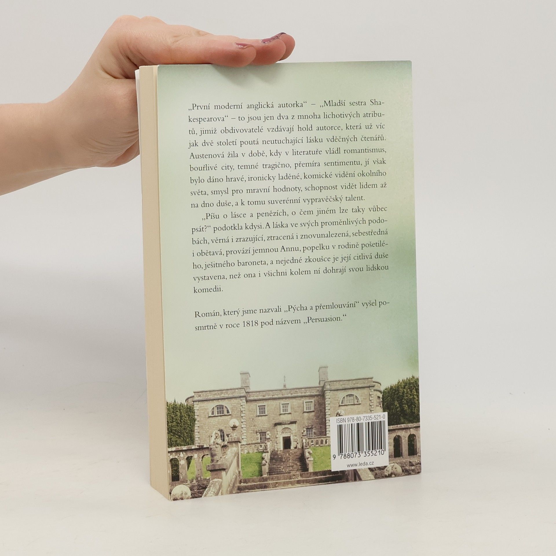„První moderní anglická autorka“, „mladší sestra Shakespearova“ to jsou jen dva z mnoha lichotivých atributů, jimiž obdivovatelé vzdávají hold autorce, která už víc jak dvě století poutá neutuchající lásku vděčných čtenářů. Austenová žila v době, kdy v literatuře vládl romantismus, bouřlivé city, temné tragično, přemíra sentimentu, jí však bylo dáno hravé, ironicky laděné, komické vidění okolního světa, smysl pro mravní hodnoty, schopnost vidět lidem až na dno duše, a k tomu suverénní vypravěčský talent. „Píšu o lásce a penězích, o čem jiném lze taky vůbec psát?“ podotkla kdysi. A láska ve svých proměnlivých podobách, věrná i zrazující, ztracená i znovunalezená, sebestředná i obětavá, provází jemnou Annu, popelku v rodině pošetilého, ješitného baroneta, a nejedné zkoušce je její citlivá duše vystavena, než ona i všichni kolem ní dohrají svou lidskou komedii. Román, který jsme nazvali Pýcha a přemlouvání, vyšel posmrtně v roce 1818 pod názvem Persuasion.