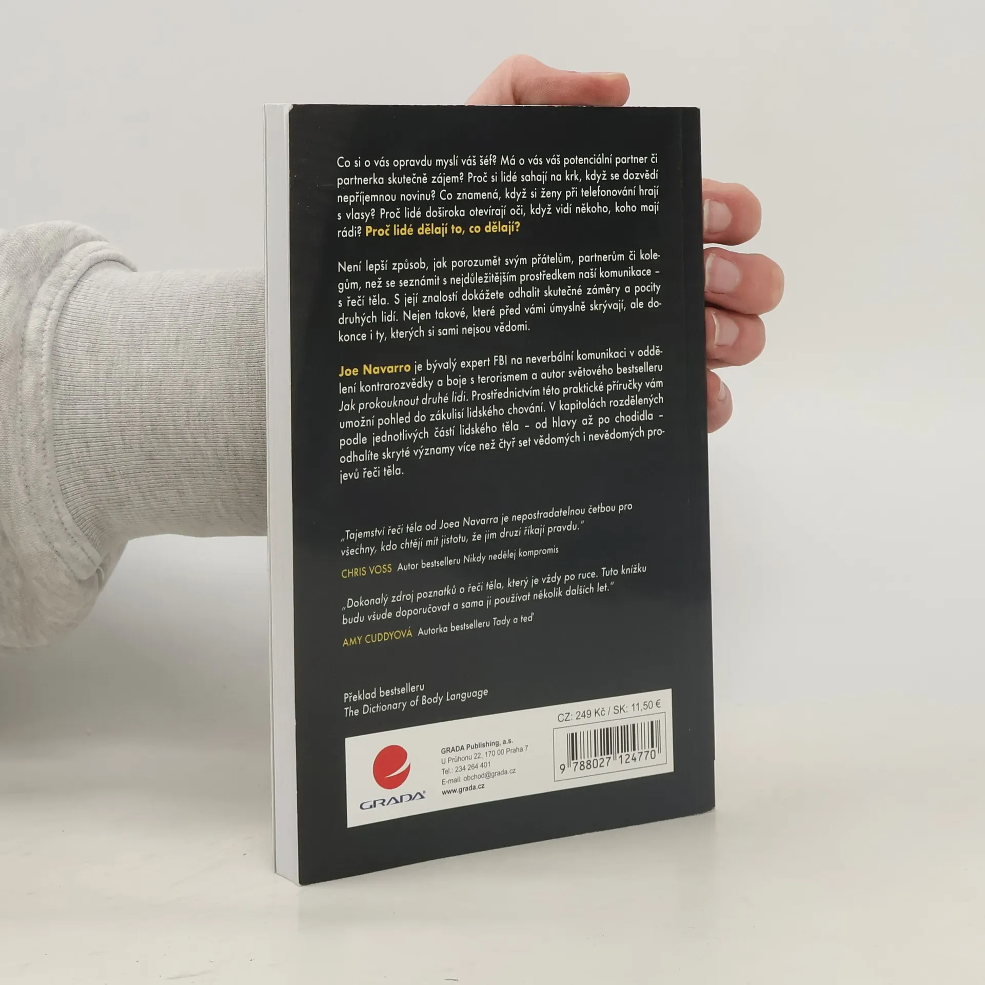 • Co si o vás opravdu myslí váš šéf? • Má o vás váš potenciální partner či partnerka skutečně zájem? • Proč si lidé sahají na krk, když se dozví nepříjemnou novinu? • Co znamená, když si ženy při telefonování hrají s vlasy? • Proč lidé doširoka otevírají oči, když vidí někoho, koho mají rádi? Proč lidé dělají to, co dělají? Není lepší způsob, jak porozumět svým přátelům, partnerům či kolegům, než se seznámit s nejdůležitějším prostředkem naší komunikace – s řečí těla. S její znalostí dokážete odhalit skutečné záměry a pocity druhých lidí. Nejen takové, které před vámi úmyslně skrývají, ale dokonce i ty, kterých si sami nejsou vědomi. Joe Navarro je bývalý expert FBI na neverbální komunikaci v oddělení kontrarozvědky a boje s terorismem a autor světového bestselleru Jak prokouknout druhé lidi. Prostřednictvím této praktické příručky vám umožní pohled do zákulisí lidského chování. V kapitolách rozdělených podle jednotlivých částí lidského těla – od hlavy až po chodidla – odhalíte skryté významy více než čtyř set vědomých i nevědomých projevů řeči těla.