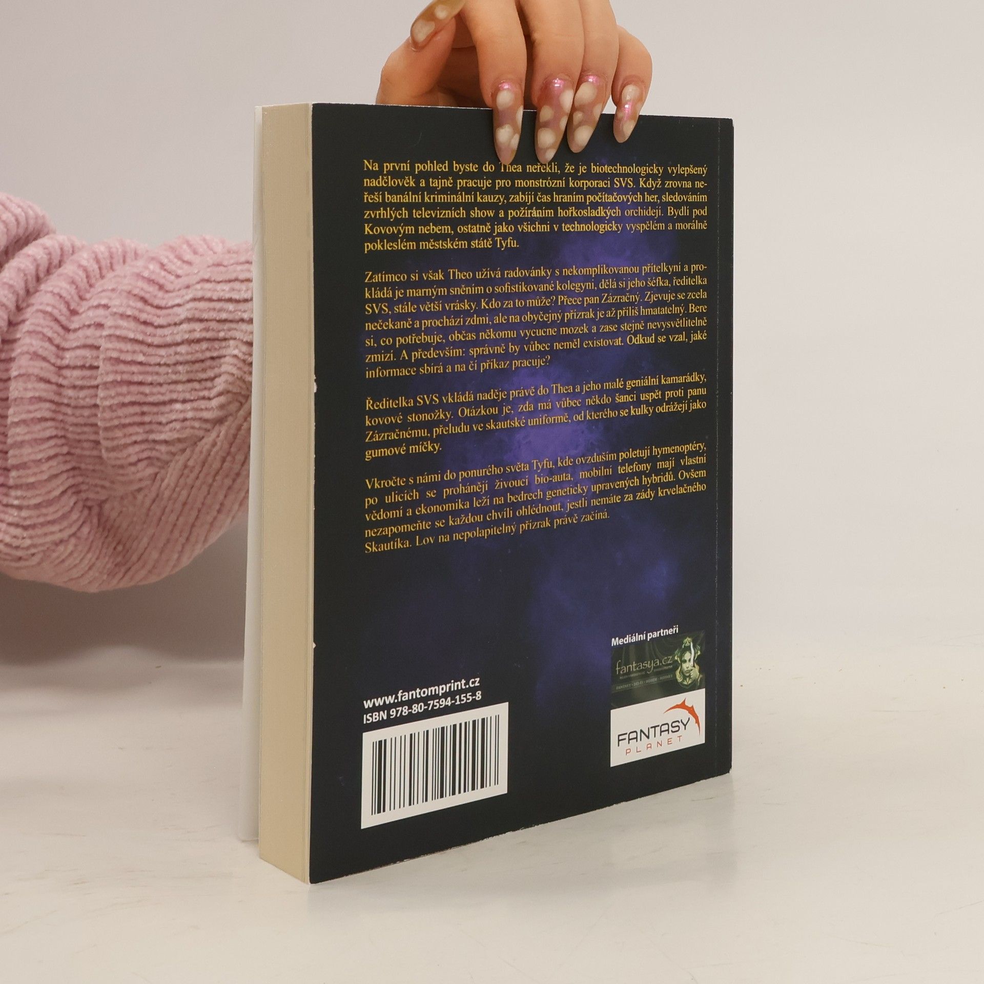 Když zrovna neřeší banální kriminální kauzy, zabíjí čas hraním počítačových her, sledováním zvrhlých televizních show a požíráním hořkosladkých orchidejí. Bydlí pod Kovovým nebem, ostatně jako všichni v technologicky vyspělém a morálně pokleslém městském státě Tyfu. Zatímco si však Theo užívá radovánky s nekomplikovanou přítelkyní a prokládá je marným sněním o sofistikované kolegyni, dělá si jeho šéfka, ředitelka SVS, stále větší vrásky. Kdo za to může? Přece pan Zázračný. Zjevuje se zcela nečekaně a prochází zdmi, ale na obyčejný přízrak je až příliš hmatatelný. Bere si, co potřebuje, občas někomu vycucne mozek a zase stejně nevysvětlitelně zmizí. A především: správně by vůbec neměl existovat. Odkud se vzal, jaké informace sbírá a na čí příkaz pracuje? Ředitelka SVS. vkládá naděje právě do Thea a jeho malé geniální kamarádky, kovové stonožky. Otázkou je, zda má vůbec někdo šanci uspět proti panu Zázračnému, přeludu ve skautské uniformě, od kterého se kulky odrážejí jako gumové míčky. Vkročte s námi do ponurého světa Tyfu, kde ovzduším poletují hymenoptéry, po ulicích se prohánějí živoucí bio-auta, mobilní telefony mají vlastní vědomí a ekonomika leží na bedrech geneticky upravených hybridů. Ovšem nezapomeňte se každou chvíli ohlédnout, jestli nemáte za zády krvelačného Skautíka. Lov na nepolapitelný přízrak právě začíná.