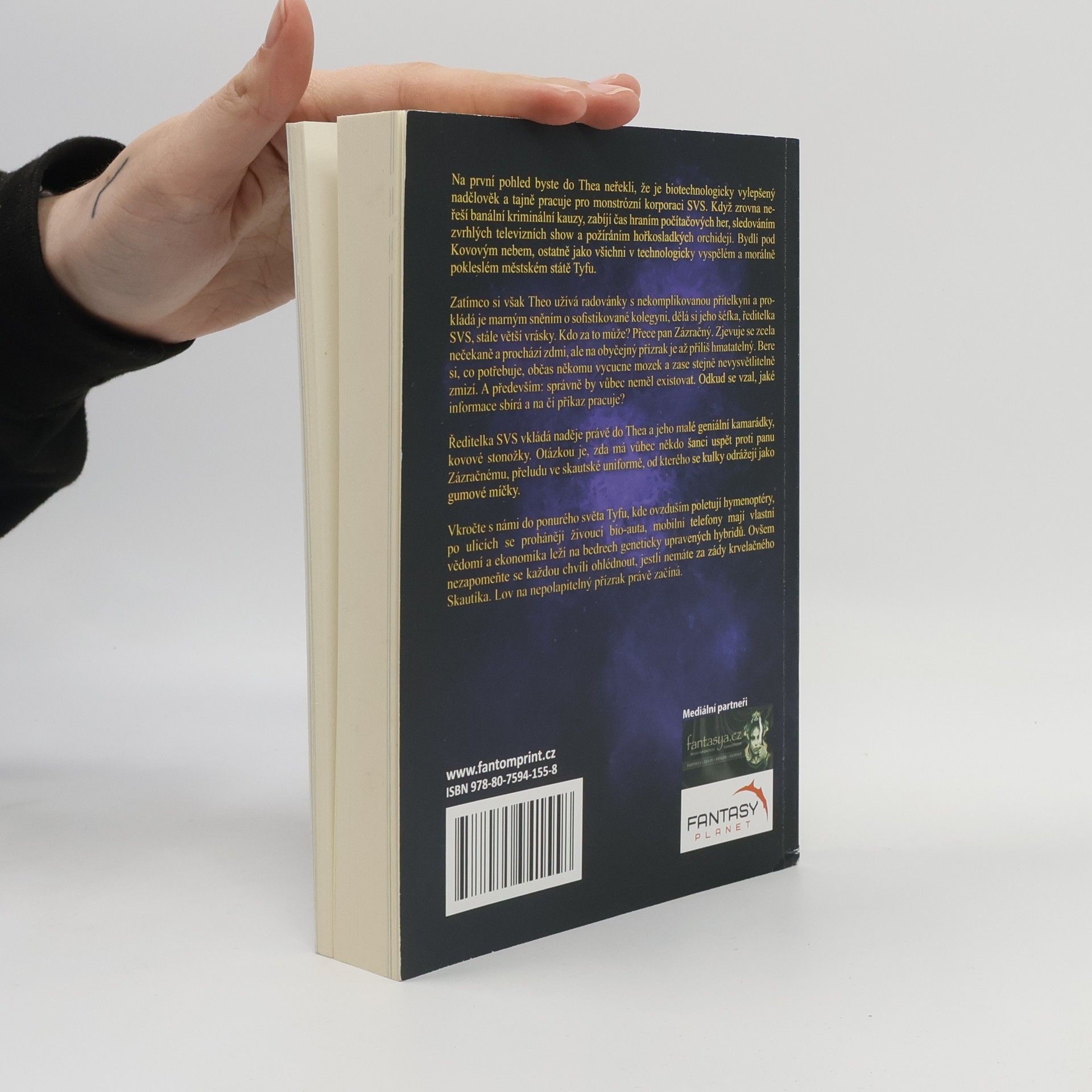 Když zrovna neřeší banální kriminální kauzy, zabíjí čas hraním počítačových her, sledováním zvrhlých televizních show a požíráním hořkosladkých orchidejí. Bydlí pod Kovovým nebem, ostatně jako všichni v technologicky vyspělém a morálně pokleslém městském státě Tyfu. Zatímco si však Theo užívá radovánky s nekomplikovanou přítelkyní a prokládá je marným sněním o sofistikované kolegyni, dělá si jeho šéfka, ředitelka SVS, stále větší vrásky. Kdo za to může? Přece pan Zázračný. Zjevuje se zcela nečekaně a prochází zdmi, ale na obyčejný přízrak je až příliš hmatatelný. Bere si, co potřebuje, občas někomu vycucne mozek a zase stejně nevysvětlitelně zmizí. A především: správně by vůbec neměl existovat. Odkud se vzal, jaké informace sbírá a na čí příkaz pracuje? Ředitelka SVS. vkládá naděje právě do Thea a jeho malé geniální kamarádky, kovové stonožky. Otázkou je, zda má vůbec někdo šanci uspět proti panu Zázračnému, přeludu ve skautské uniformě, od kterého se kulky odrážejí jako gumové míčky. Vkročte s námi do ponurého světa Tyfu, kde ovzduším poletují hymenoptéry, po ulicích se prohánějí živoucí bio-auta, mobilní telefony mají vlastní vědomí a ekonomika leží na bedrech geneticky upravených hybridů. Ovšem nezapomeňte se každou chvíli ohlédnout, jestli nemáte za zády krvelačného Skautíka. Lov na nepolapitelný přízrak právě začíná.