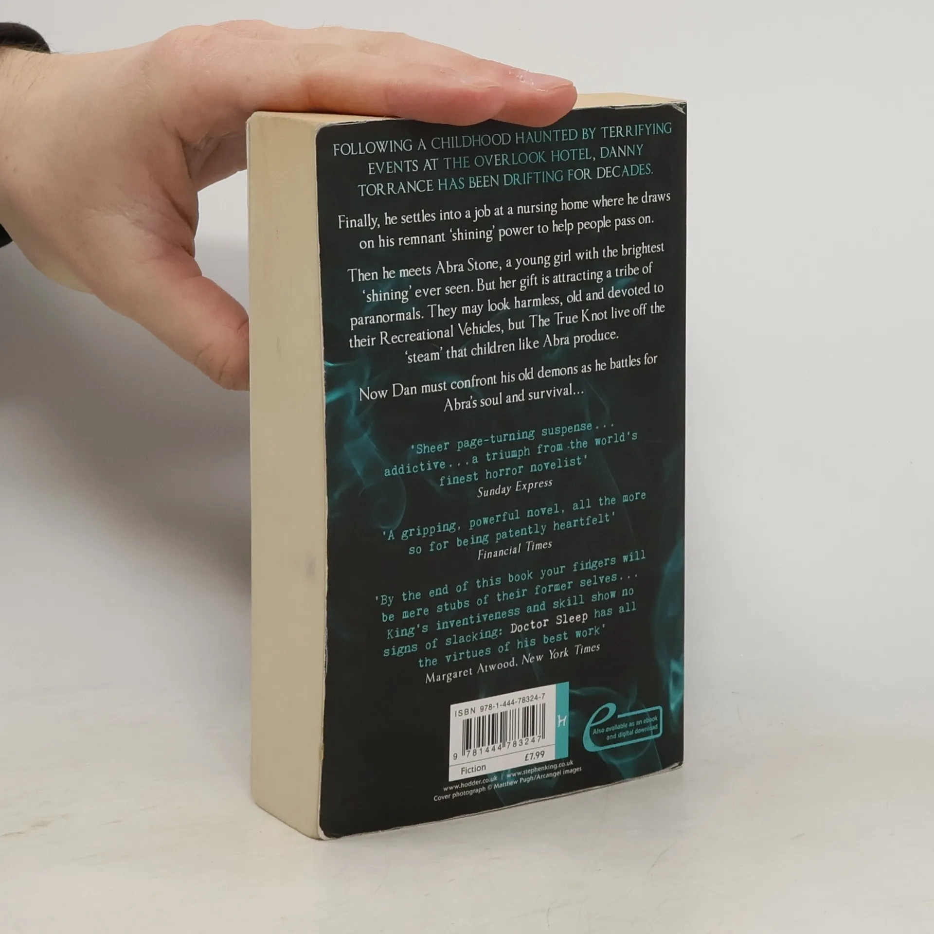 FOLLOWING A CHILDHOOD HAUNTED BY TERRIFYING EVENTS AT THE OVERLOOK HOTEL, DANNY TORRANCE HAS BEEN DRIFTING FOR DECADES. Finally he settles into a job at a nursing home where he draws on his remnant 'shining' power to help people pass on. then he meets Abra Stone, a young girl with the brightest 'shining' ever seen. But her gift is attracting a tribe of paranormals.. They may look harmless, old and devoted to their Recreational Vehicles, but The True Knot live off the 'steam' that children like Abra produce. Now Dan must confront his old demons as he battles for Abra's soul and survival... ~from back cover
