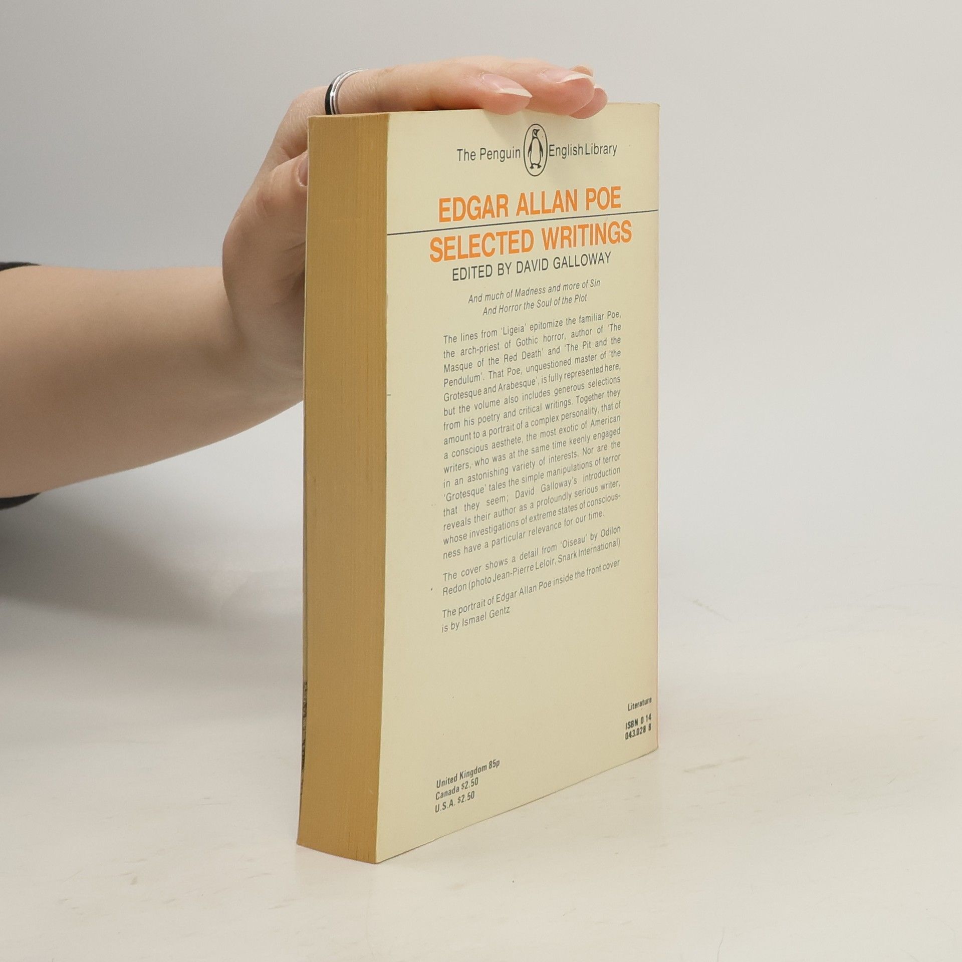 And much of Madness and more of Sin And Horror the Soul of the Plot The lines from 'Ligeia' epitomize the familiar Poe, the arch-priest of Gothic horror, author of 'The Masque of the Red Death' and 'The Pit and the Pendulum'. That Poe, unquestioned master of 'the Grotesque and Arabesque', is fully represented here, but the volume also includes generous selections from his poetry and critical writings. Together they amount to a portrait of a complex personality, that of a conscious aesthete, the most exotic of American writers, who was at the same time keenly engaged in an astonishing variety of interests. Nor are the 'Grotesque' tales the simple manipulations of terror that they seem; David Galloway's introduction reveals their author as a profoundly serious writer, whose investigations of extreme states of conscious- ness have a particular relevance for our time. The cover shows a detail from 'Oiseau' by Odilon Redon (photo Jean-Pierre Leloir, Snark International) The portrait of Edgar Allan Poe inside the front cover is by Ismael Gentz --back cover