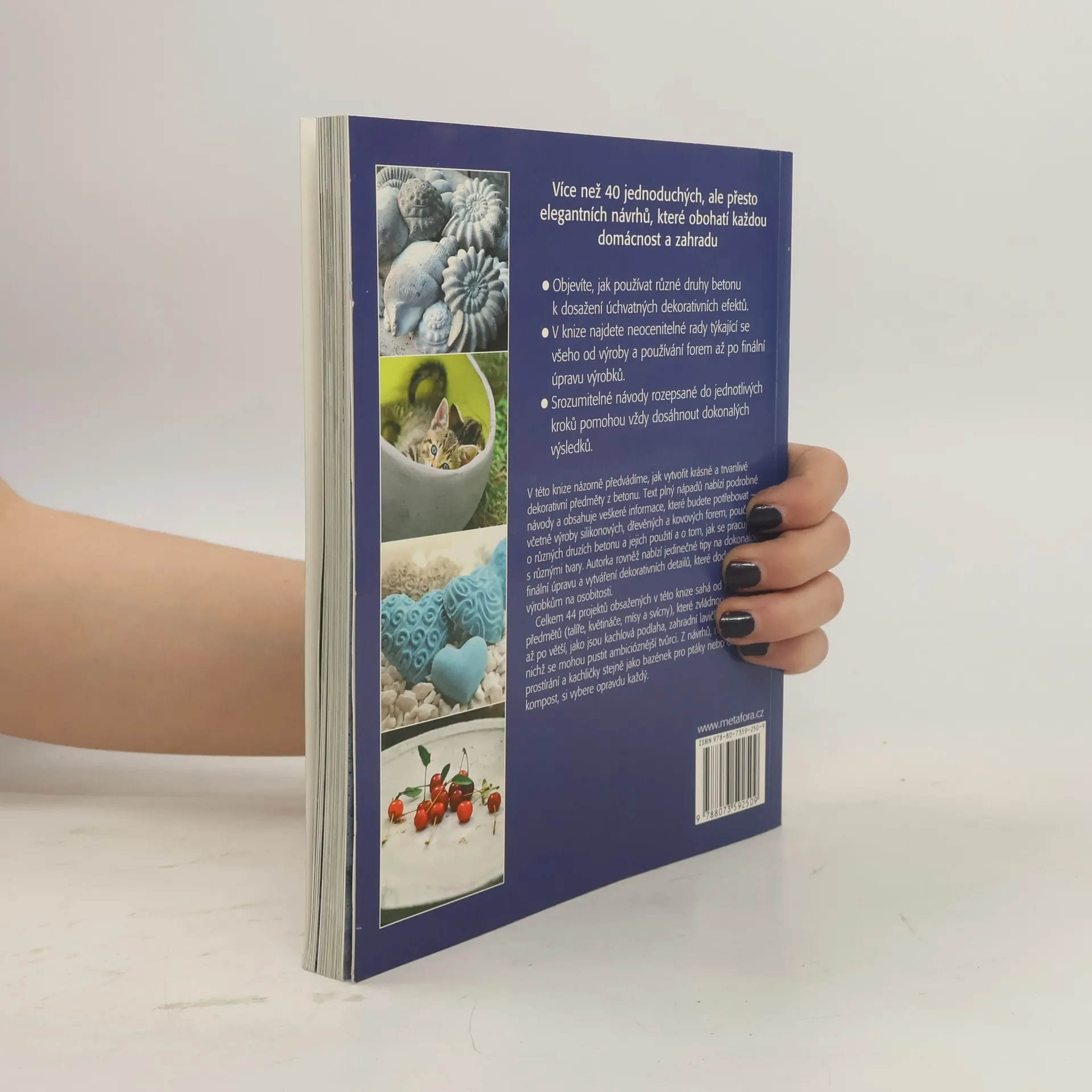 V této knize názorně předvádíme, jak vytvořit krásné a trvanlivé dekorativní předměty z betonu. Text plný nápadů nabízí podrobné návody a obsahuje veškeré informace, které budete potřebovat - včetně výroby silikonových, dřevěných a kovových forem, poučení o různých druzích betonu a jejich použití a o tom, jak se pracuje s různými tvary. Autorka rovněž nabízí jedinečné tipy na dokonalou finální úpravu a vytváření dekorativních detailů, které dodají vašim výrobkům na osobitosti. Objevíte, jak používat různé druhy betonu k dosažení úchvatných dekorativních efektů. V knize najdete neocenitelné rady týkající se všeho od výroby a používání forem až po finální úpravu výrobků. Srozumitelné návody rozepsané do jednotlivých kroků pomohou vždy dosáhnout dokonalých výsledků. Celkem 44 projektů obsažených v této knize sahá od malých předmětů (talíře, květináče, mísy a svícny), které zvládnou i začátečníci, až po větší, jako jsou kachlová podlaha, zahradní lavičky a stůl, do nichž se mohou pustit ambicióznější tvůrci. Z návrhů, mezi nimiž jsou prostírání a kachličky stejně jako bazének pro ptáky nebo ohrádka na kompost, si vybere opravdu každý.