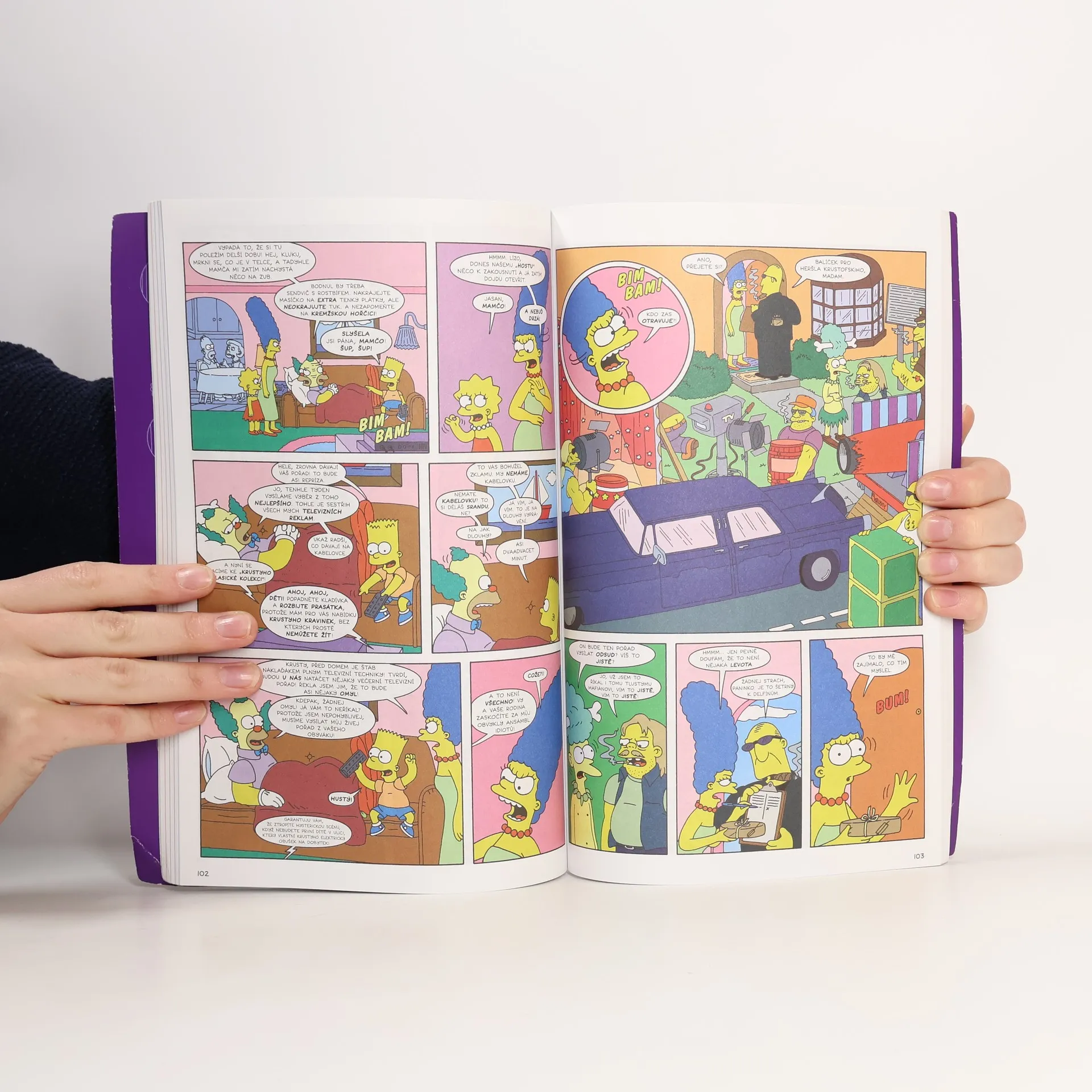 Nová, tentokrát ještě tlustší kniha se slavnou žlutou rodinkou! Homer se stane televizní hvězdou! Dům Simpsonových obsadí trojice nerdů... a co hůře, brzo se tam přistěhuje i šáša Krusty. Obyvatelé Springfieldu se stanou závislí na koblihách, Bart Simpsons rozpoutá komiksem proces století a Krusty pozve několik šťastlivců na procházku do své továrny na čokoládu... což nemusí všichni přežít. A to jsme se ani nezmínili o tom, že se děda Simpson vydá na dráhu zločinu! Prostě další Simpsonovská pecka!