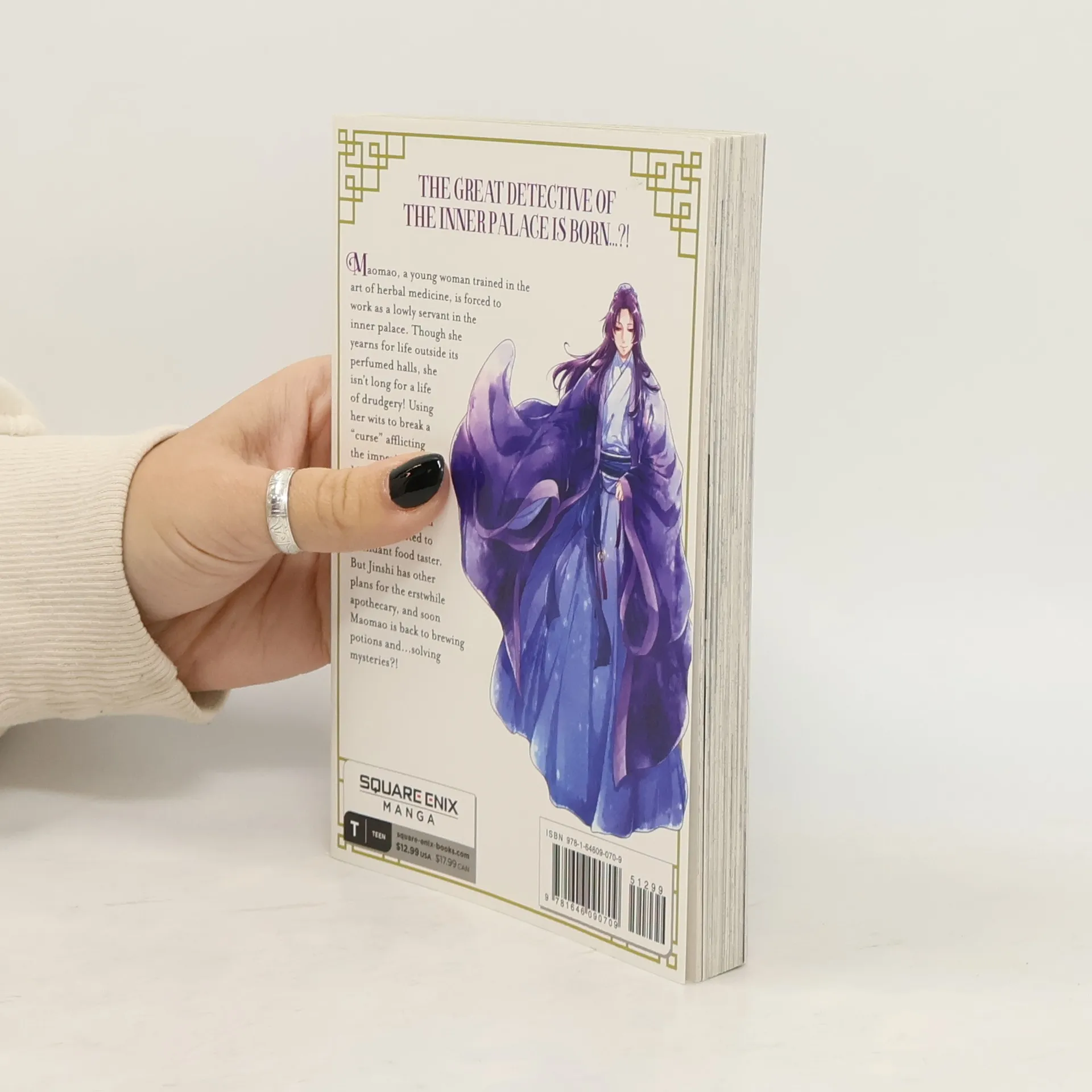 Maomao, a young woman trained in the art of herbal medicine, is forced to work as a lowly servant in the inner palace. Though she yearns for life outside its perfumed halls, she isn't long for a life of drudgery! Using her wits to break a "curse" afflicting the imperial heirs, Maomao attracts the attentions of the handsome eunuch Jinshi and is promoted to attendant food taster. But Jinshi has other plans for the erstwhile apothecary, and soon Maomao is back to brewing potions and...solving mysteries?!
