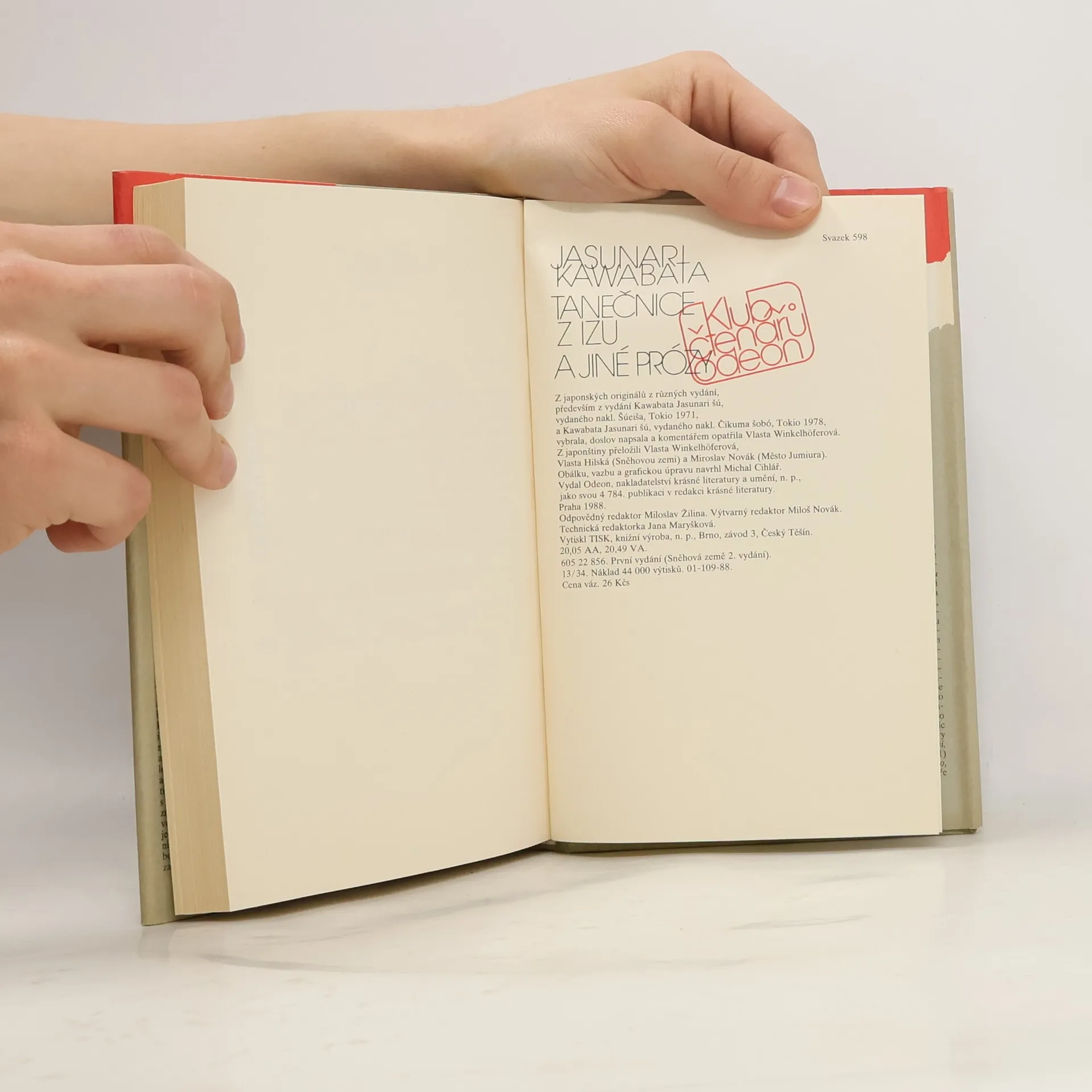 Souborné vydání Kawabatových próz: Tanečnice z Izu, Sněhová země (přel. V. Hilská), Meidžin, Deník šestnáctiletého, Povídky na dlaň (Letní střevíčky, Díky, Modlitba panen, Případ mrtvé tváře), Hiroko odchází, Město Jumiura (přel. M. Novák) a Odraz měsíce na vodě. Z japonských originálů vybrala a přeložila Vlasta Winkelhöferová.