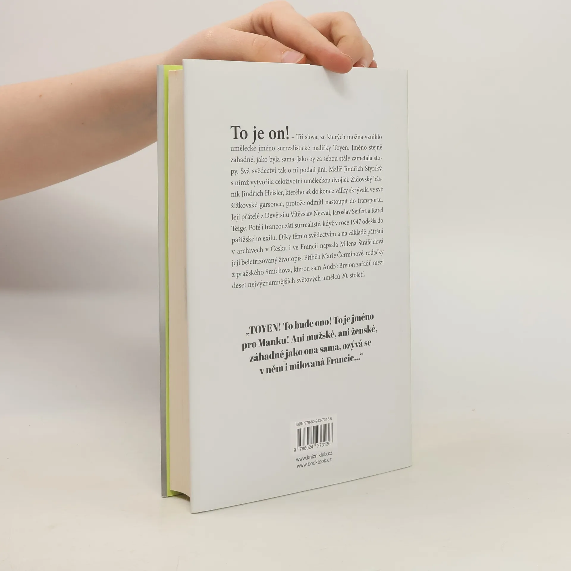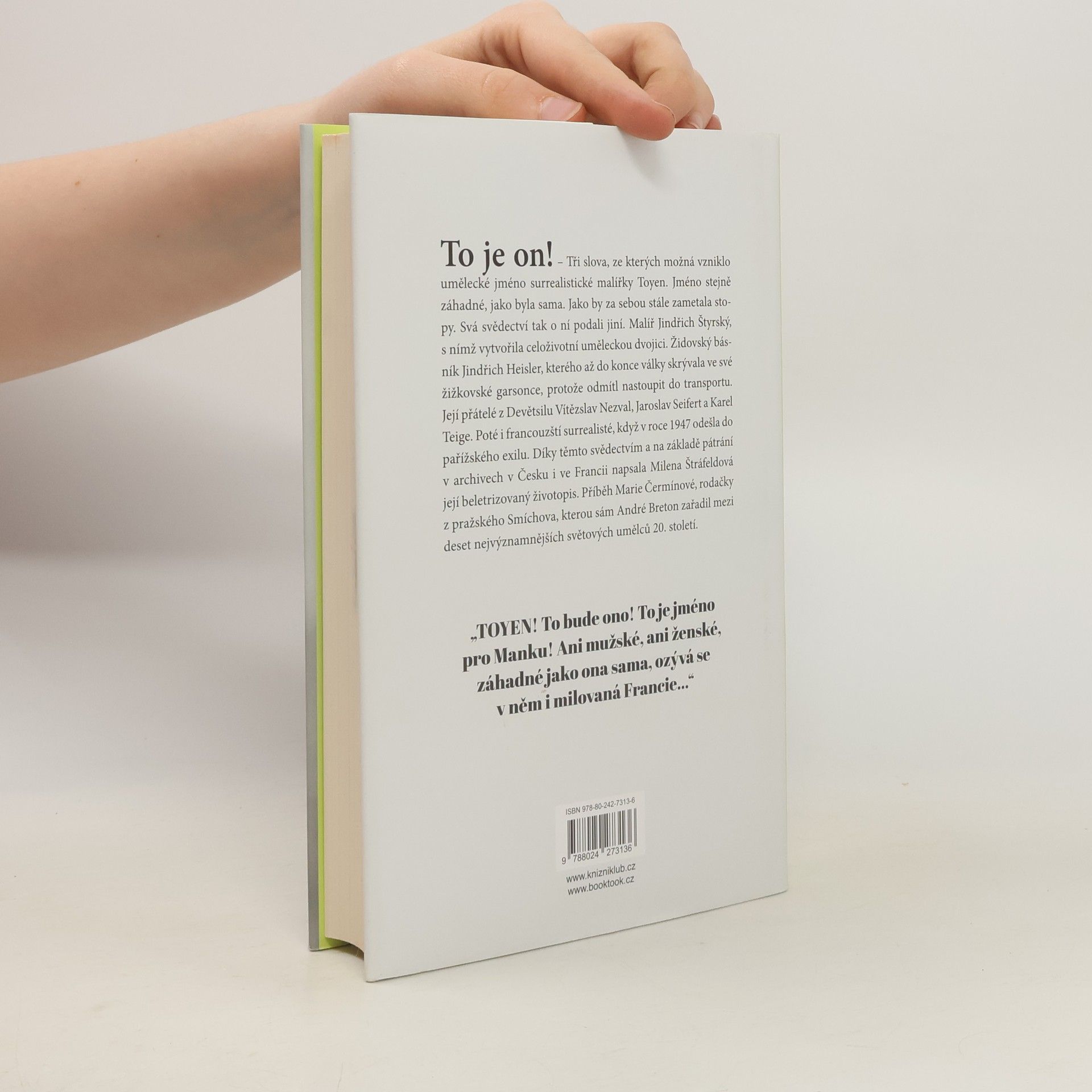 To je on! – Tři slova, ze kterých možná vzniklo umělecké jméno surrealistické malířky Toyen. Jméno stejně záhadné, jako byla sama. Jako by za sebou stále zametala stopy. Svá svědectví tak o ní podali jiní. Malíř Jindřich Štyrský, se kterým vytvořila celoživotní uměleckou dvojici. Židovský básník Jindřich Heisler, kterého až do konce války skrývala ve své žižkovské garsonce, protože odmítl nastoupit do transportu. Její přátelé z Devětsilu Vítězslav Nezval, Jaroslav Seifert nebo Karel Teige. Nebo francouzští surrealisté, když v r. 1947 odešla do pařížského exilu. Díky těmto svědectvím, ale i na základě pátrání v archivech v Česku a ve Francii, napsala Milena Štráfeldová její beletrizovaný životopis. Příběh Marie Čermínové, rodačky z pražského Smíchova, kterou sám André Breton zařadil mezi deset nejvýznamnějších světových umělců 20. století.