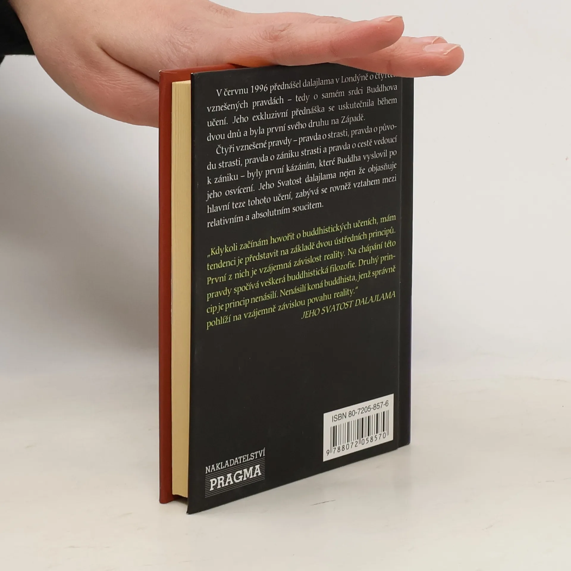 V červnu 1996 přednášel dalajlama v Londýně o čtyřech vznešených pravdách - tedy o samém srdci Buddhova učení. Jeho exkluzivní přednáška se uskutečnila během dvou dnů a byla první svého druhu na Západě. Čtyři vznešené pravdy - pravda o strasti, pravda o původu strasti, pravda o zániku strasti a pravda o cestě vedoucí k zániku - byly první kázáním, které Buddha vyslovil po jeho osvícení. Jeho Svatost dalajlama nejen že objasňuje hlavní teze tohoto učení, zabývá se rovněž vztahem mezi relativním a absolutním soucitem. "Kdykoli začínám hovořit o buddhistických učeních, mám tendenci je představit na základě dvou ústředních principů. První z nich je vzájemná závislost reality. Na chápání této pravdy spočívá veškerá buddhistická filozofie. Druhý princip je princip nenásilí. Nenásilí koná buddhista, jenž správně pohlíží na vzájemně závislou povahu reality." JEHO SVATOST DALAJLAMA
