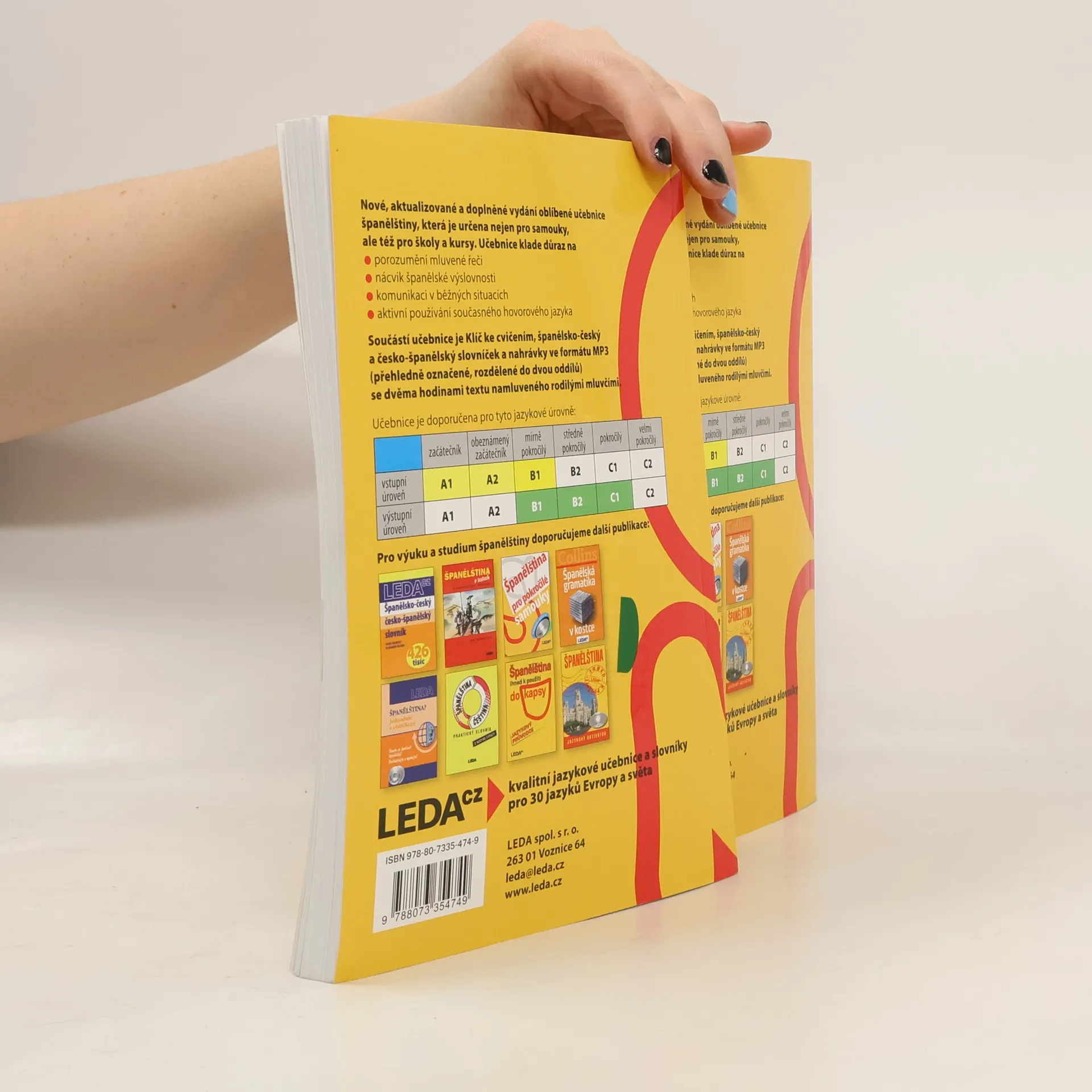 Nové, aktualizované a doplněné vydání oblíbené učebnice zaměřené na výuku evropské španělštiny (doplňkově je pozornost věnována také španělštině latinskoamerické), a to jednoduchou, přehlednou a zábavnou metodou. Ve 44 lekcích uživatel nalezne tematicky i stylisticky rozmanité texty, nejfrekventovanější slovní zásobu španělštiny a běžné frazeologismy. Gramatika je vysvětlována co nejjednodušeji a velmi přehledně a je doprovázena řadou pestrých cvičení. Formou poznámek k textu autorka seznamuje uživatele s reáliemi hispanofonních zemí. Klíč ke cvičením a závěrečný test slouží k samokontrole úspěšnosti. Nedílnou součástí je CD s nahrávkami v MP3. Učebnice je určena nejen samoukům, ale i účastníkům jazykových kursů, studentům středních škol a učilišť i těm, kdo si chtějí rozšířit či osvěžit již dříve získané znalosti španělského jazyka a používat ho v běžných životních situacích. Zvládnutí učebnice zaručuje dosažení stupně pokročilosti B2 až C1 podle doporučení Rady Evropy.