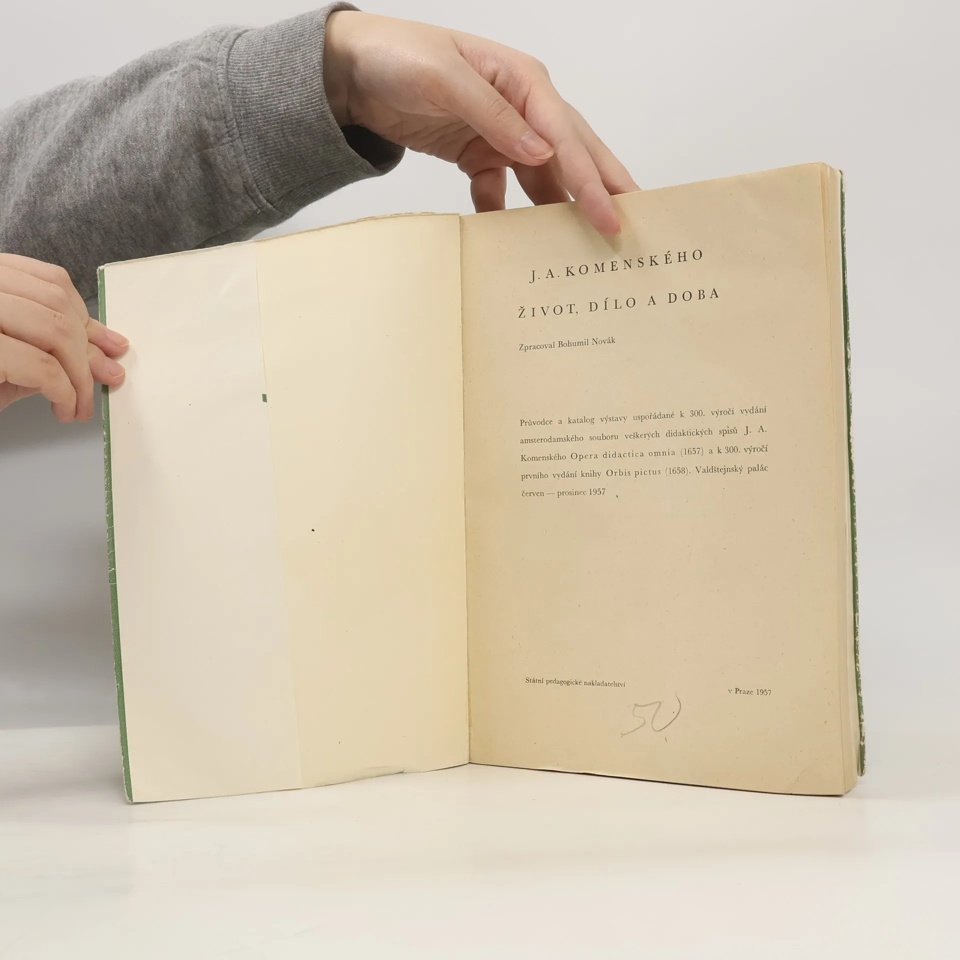 Průvodce a katalog výstavy uspořádané k 300.výročí vydání amsterodámského souboru veškerých didakrických spisů J.A.Komenského Opera didactica ohniva 1657 a k výroci prvního vydání knihy Orbis pictus 1658 .Valdštejnský palác cerven-prosinec 1957