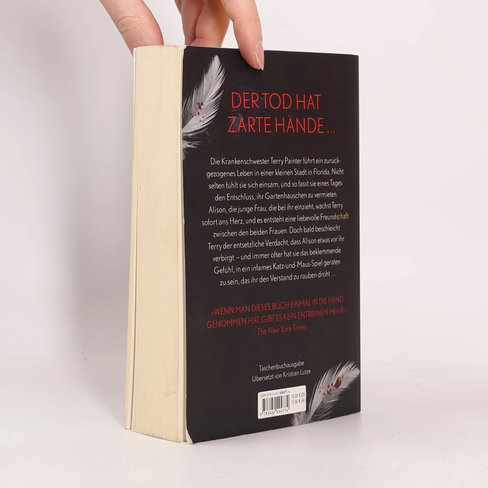 Der Tod hat zarte Hände … Die Krankenschwester Terry Painter führt ein zurückgezogenes Leben in einer kleinen Stadt in Florida. Nicht selten fühlt sie sich einsam, und so fasst sie eines Tages den Entschluss, ihr Gartenhäuschen zu vermieten. Alison, die junge Frau, die bei ihr einzieht, wächst Terry sofort ans Herz, und es entsteht eine liebevolle Freundschaft zwischen den beiden Frauen. Doch plötzlich beschleicht Terry der entsetzliche Verdacht, dass Alison etwas vor ihr verbirgt – und immer öfter hat sie das beklemmende Gefühl, in ein infames Katz-und-Maus-Spiel geraten zu sein, das ihr den Verstand zu rauben droht …