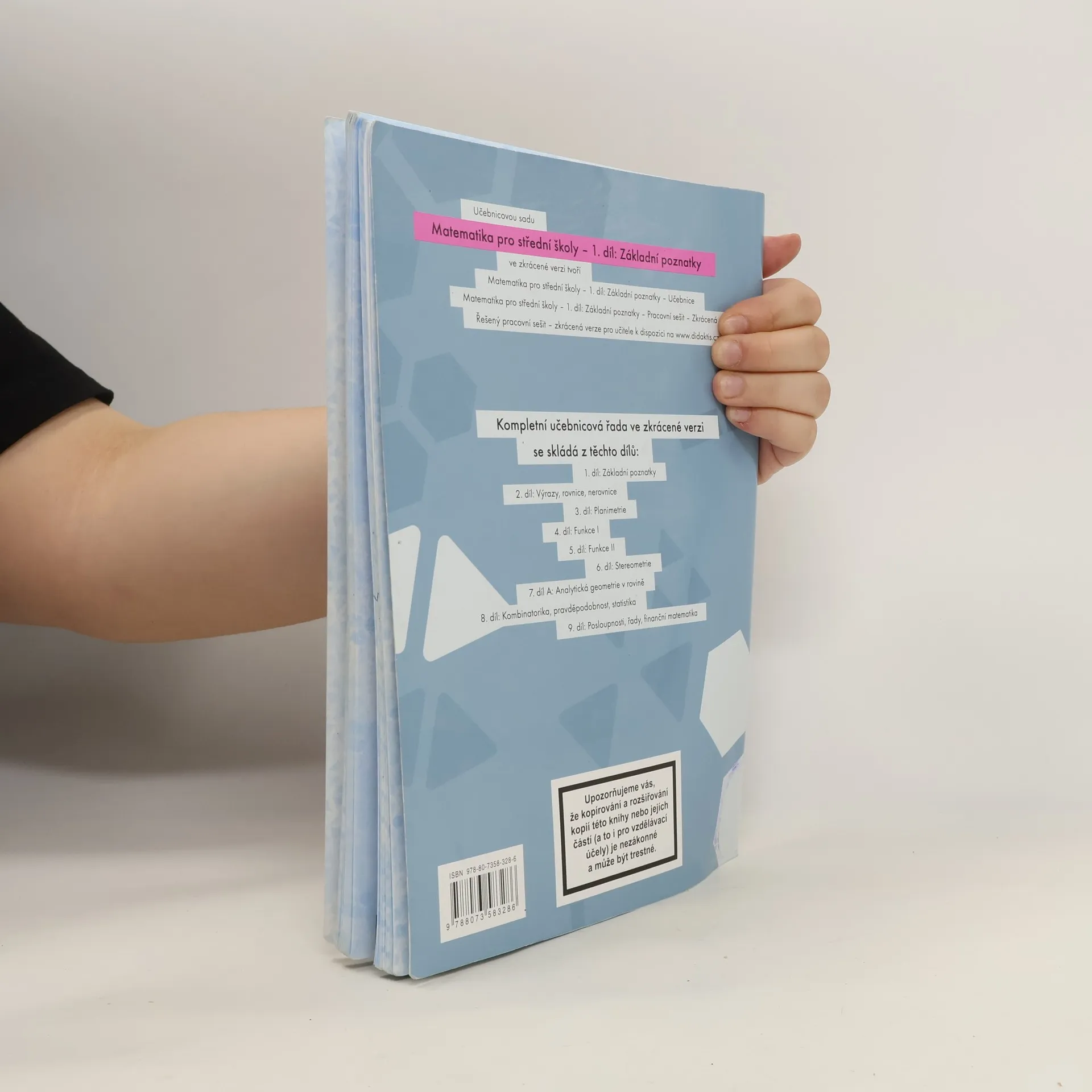 Přehledně, moderně a pro studenty přístupně zpracovaná učebnice vnáší nové možnosti do výuky matematiky na středních školách. Obsah první části zahrnuje základní poznatky o číselných oborech, výrokové logice a teorii množin. Učivo je srozumitelně a strukturovaně podáno ve výkladové části učebnice a je doplněno jednoduchými řešenými příklady.