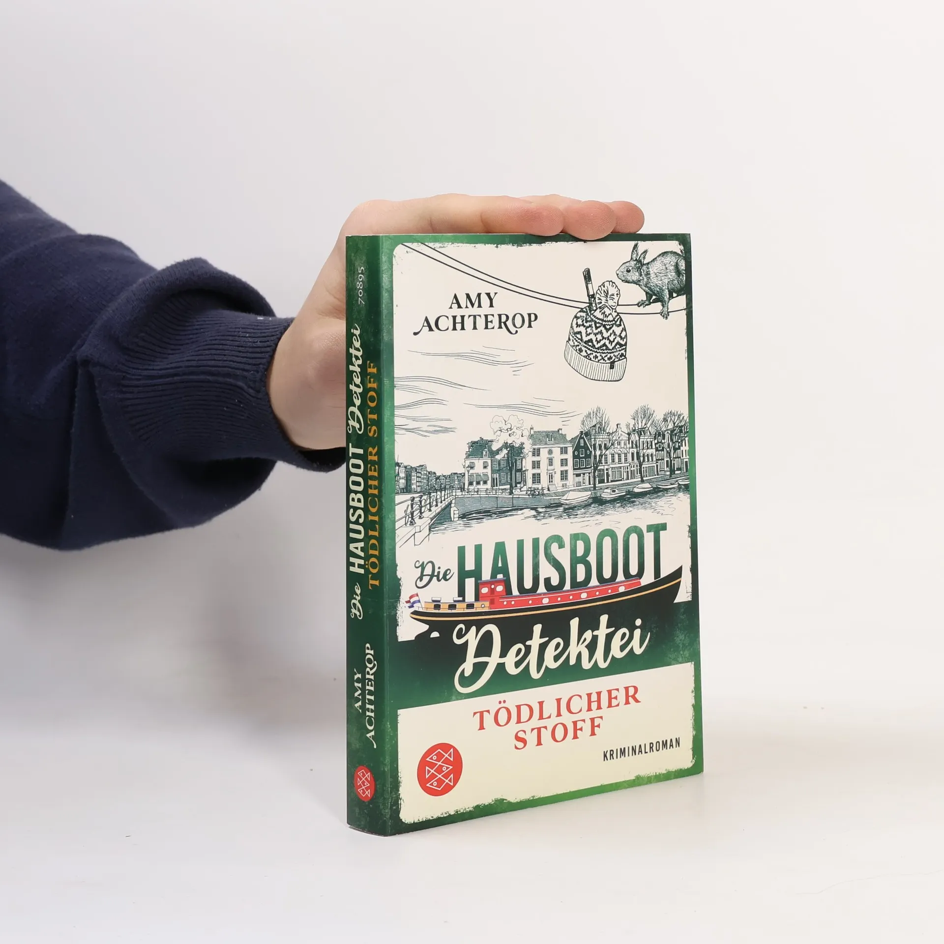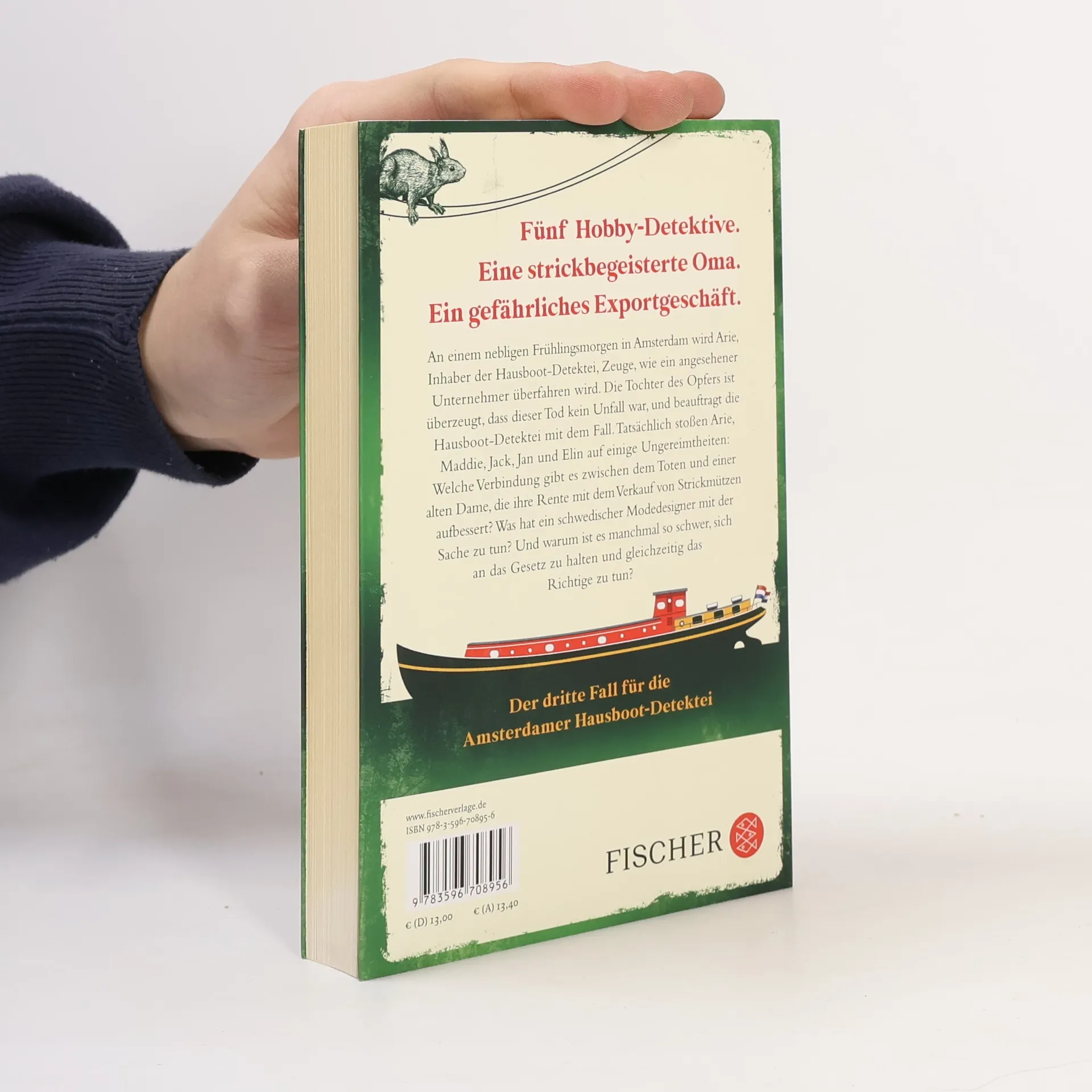 Fünf Hobby-Detektive. Eine strickbegeisterte Oma. Ein gefährliches Exportgeschäft. An einem nebligen Frühlingsmorgen in Amsterdam wird Arie, Inhaber der Hausboot-Detektei, Zeuge, wie ein angesehener Unternehmer überfahren wird. Die Tochter des Unfallopfers, ist überzeugt, dass dieser Tod kein Unfall war, und beauftragt die Hausboot-Detektei mit dem Fall. Und tatsächlich stoßen Arie, Maddie, Jack, Jan und Elin auf jede Menge Ungereimtheiten: Welche Verbindung gibt es zwischen dem Toten und Kaatje Hommel, einer alten Dame, die ihre Rente mit dem Verkauf von Strickmützen aufbessert? Was hat ein schwedischer Modedesigner mit der Sache zu tun? Dann gibt es eine weitere Leiche und die fünf Detektive müssen erfahren, dass es manchmal ganz schön schwer ist, sich an das Gesetz zu halten und gleichzeitig das Richtige zu tun. Der dritte Wohlfühl-Krimi mit der Amsterdamer Hausboot-Detektei