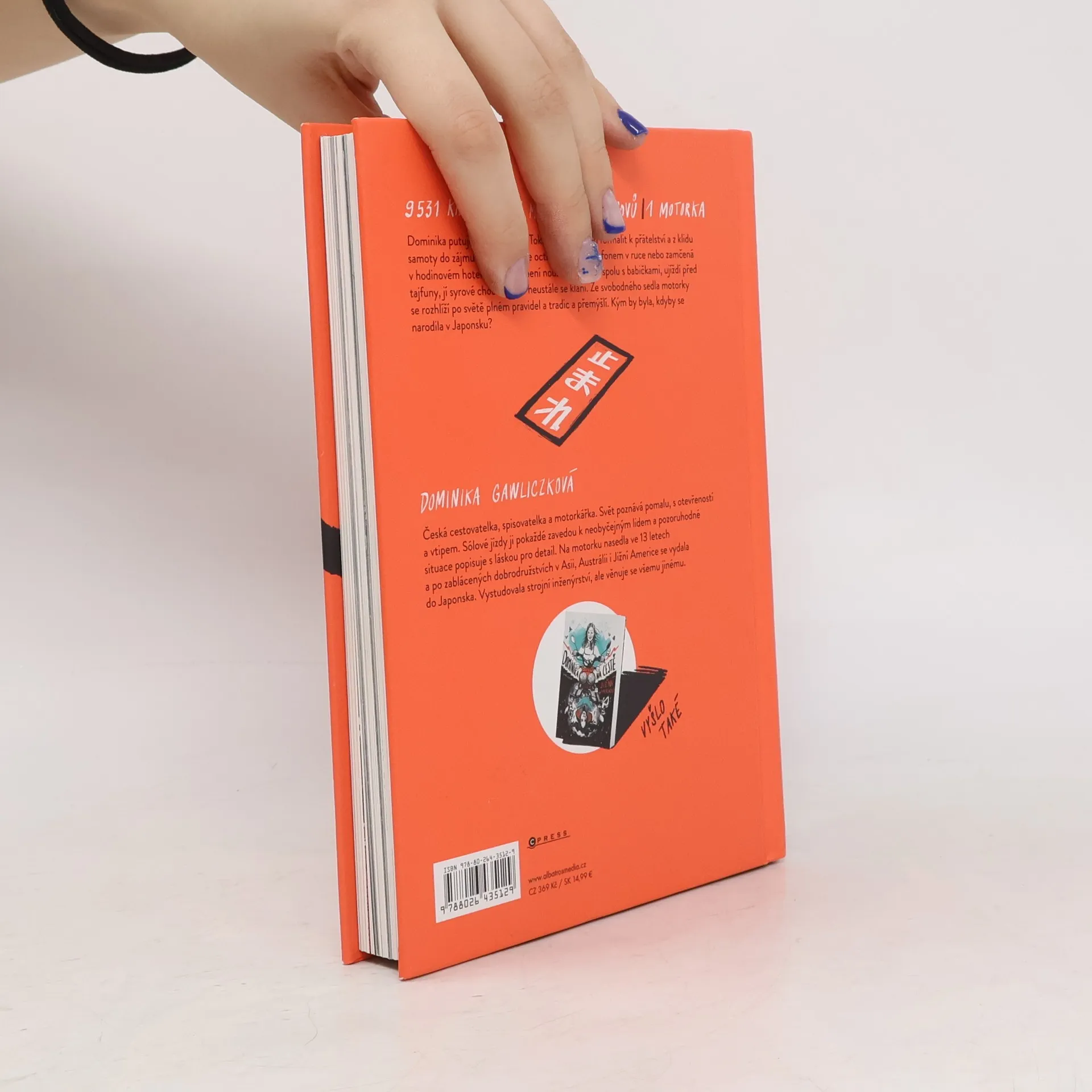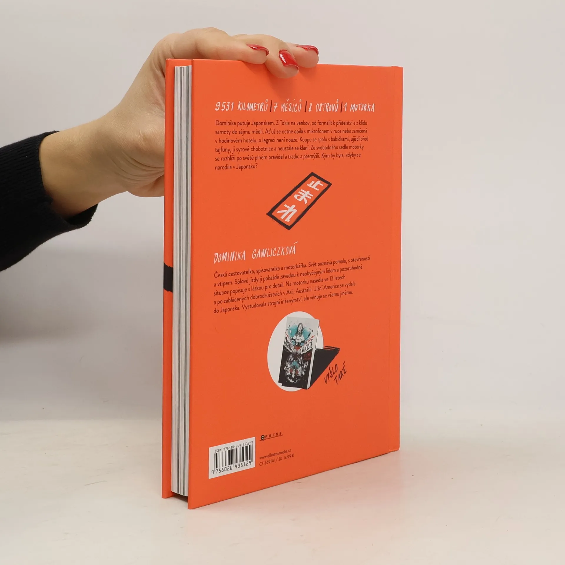 Na motorce do duše Japonska. Dominika putuje Japonskem. Z Tokia na venkov, od formalit k přátelství a z klidu samoty do zájmu médií. Ať už se octne opilá s mikrofonem v ruce nebo zamčená v hodinovém hotelu, o legraci není nouze. Koupe se spolu s babičkami, ujíždí před tajfuny, jí syrové chobotnice a neustále se klaní. Ze svobodného sedla motorky se rozhlíží po světě plném pravidel a tradic a přemýšlí. Kým by byla, kdyby se narodila v Japonsku?