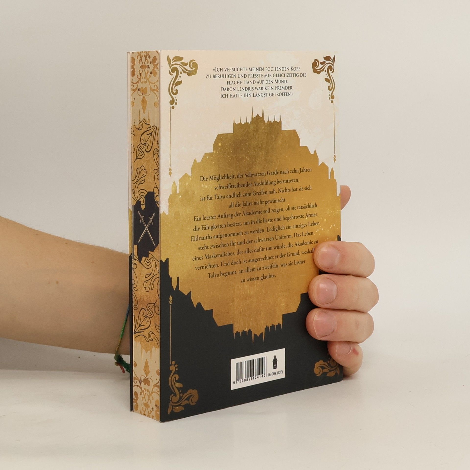 «Ich versuchte meinen pochenden Kopf zu beruhigen und presste mir gleichzeitig die flache Hand auf den Mund. Daron Lendris war kein Fremder. Ich hatte ihn längst getroffen.» Die Möglichkeit, der Schwarzen Garde nach zehn Jahren schweißtreibender Ausbildung beizutreten, ist für Talya endlich zum Greifen nah. Nichts hat sie sich all die Jahre mehr gewünscht. Ein letzter Auftrag der Akademie soll zeigen, ob sie tatsächlich die Fähigkeiten besitzt, um in die beste und begehrteste Armee Eldranths aufgenommen zu werden. Lediglich ein einziges Leben steht zwischen ihr und der schwarzen Uniform. Das Leben eines Maskendiebes, der alles dafür tun würde, die Akademie zu vernichten. Und doch ist ausgerechnet er der Grund, weshalb Talya beginnt, an allem zu zweifeln, was sie bisher zu wissen glaubte.