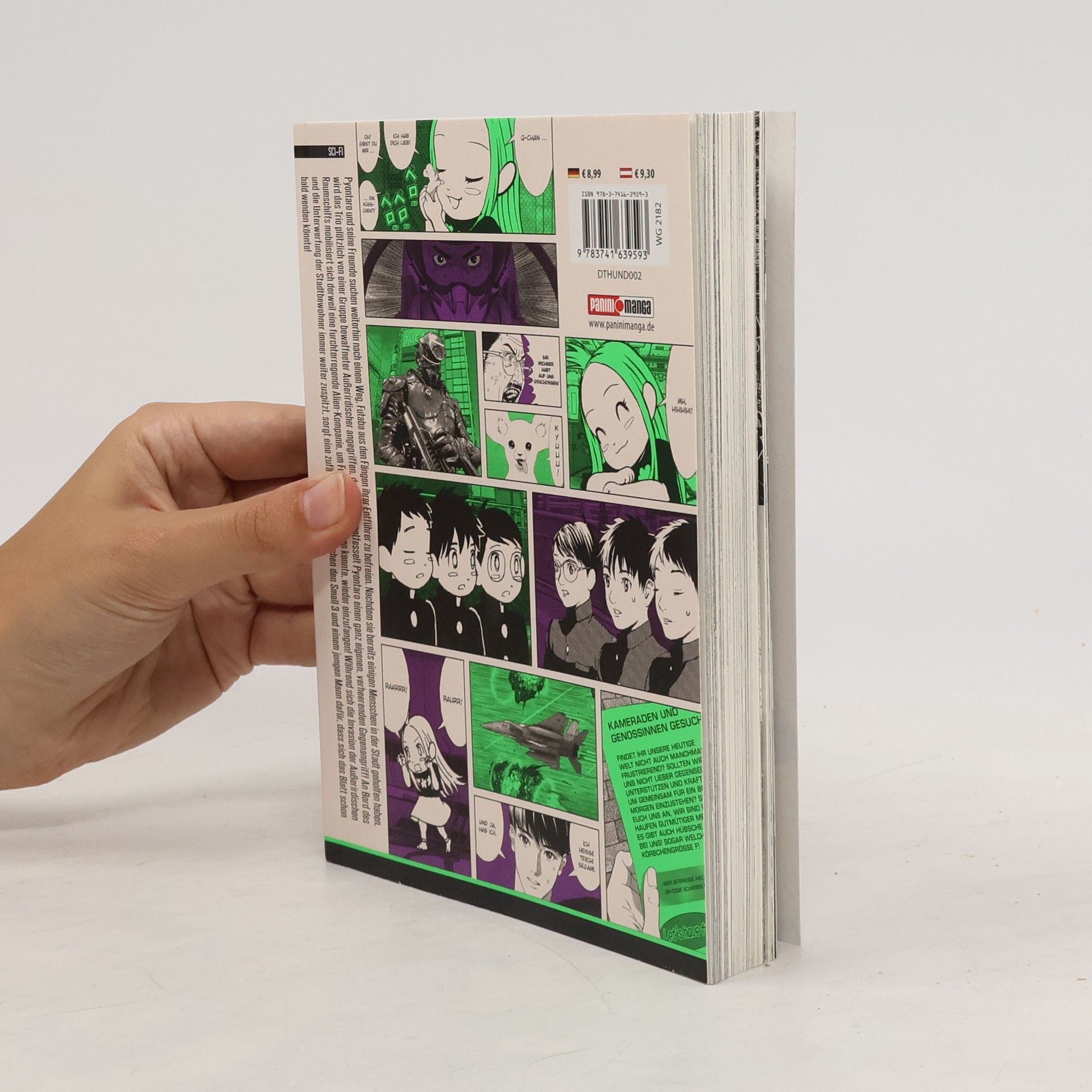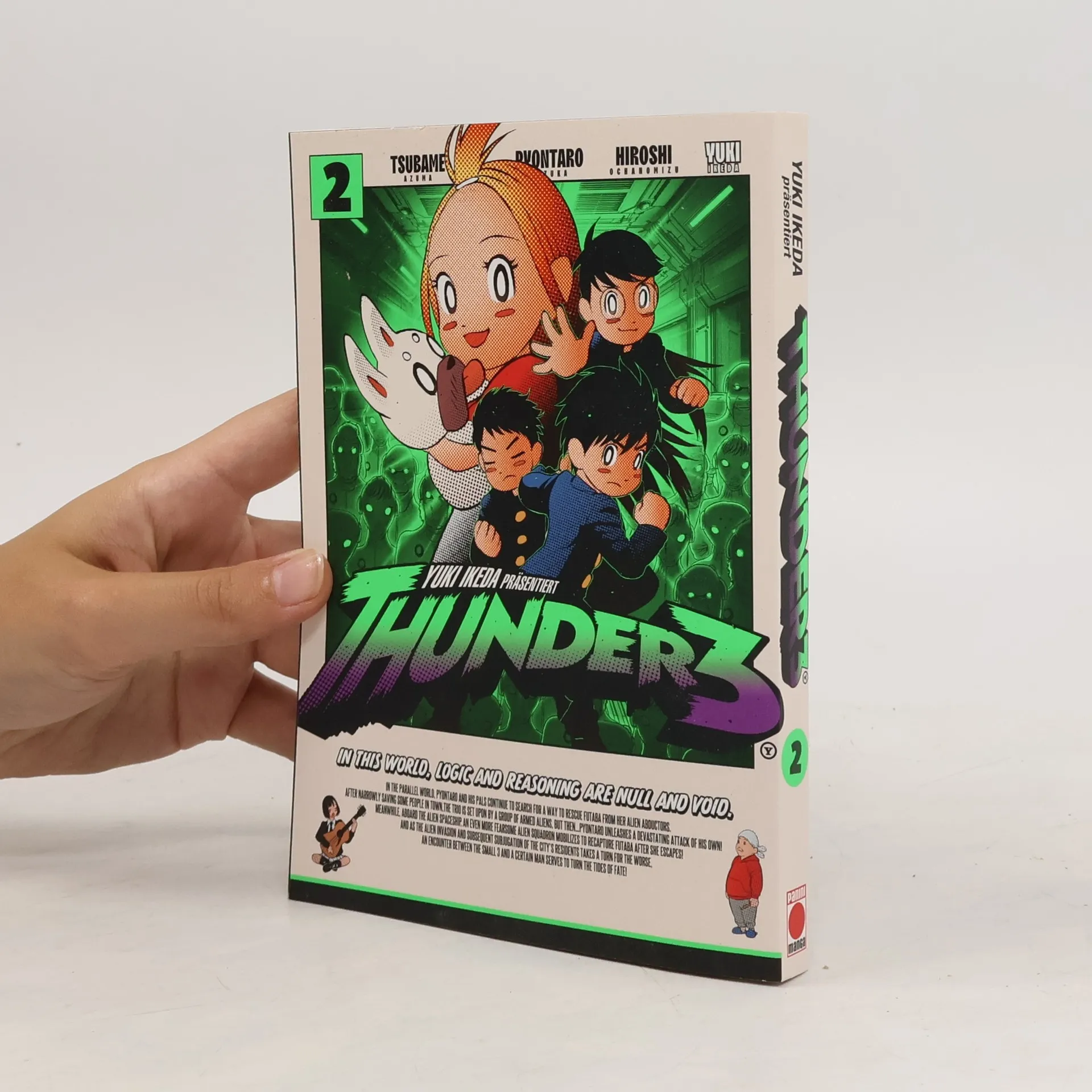 THUNDER 3 – Das ultimative Manga-Abenteuer im Multiversum! Begleite drei Freunde, die aus einem klassischen Gag-Manga im Retro-Look in eine hyperrealistische Sci-Fi-Welt im Gantz-Stil springen, um die kleine Schwester von einem der Jungen zu retten. Auf ihrem Abenteuer werden sie allerdings nicht nur mit gefährlichen Gegnern, skurrilen Situationen und überraschenden Wendungen konfrontiert … Das erwartet dich in Band 2: Pyontaro und seine Freunde suchen weiterhin nach einem Weg, Futaba aus den Fängen ihrer Entführer zu befreien. Nachdem sie bereits einigen Menschen in der Stadt geholfen haben, wird das Trio plötzlich von einer Gruppe bewaffneter Außerirdischer angegriffen, doch dann … entfesselt Pyontaro einen ganz eigenen, verheerenden Gegenangriff! An Bord des Raumschiffs mobilisiert sich derweil eine furchterregende Alien-Kompanie, um Futaba, die entkommen konnte, wieder einzufangen! Während sich die Invasion der Außerirdischen und die Unterwerfung der Stadtbewohner immer weiter zuspitzt, sorgt eine zufällige Begegnung zwischen den Small 3 und einem jungen Mann dafür, dass sich das Blatt schon bald wenden könnte! Für Fans von Action-, Abenteuer- und Sci-Fi-Manga!