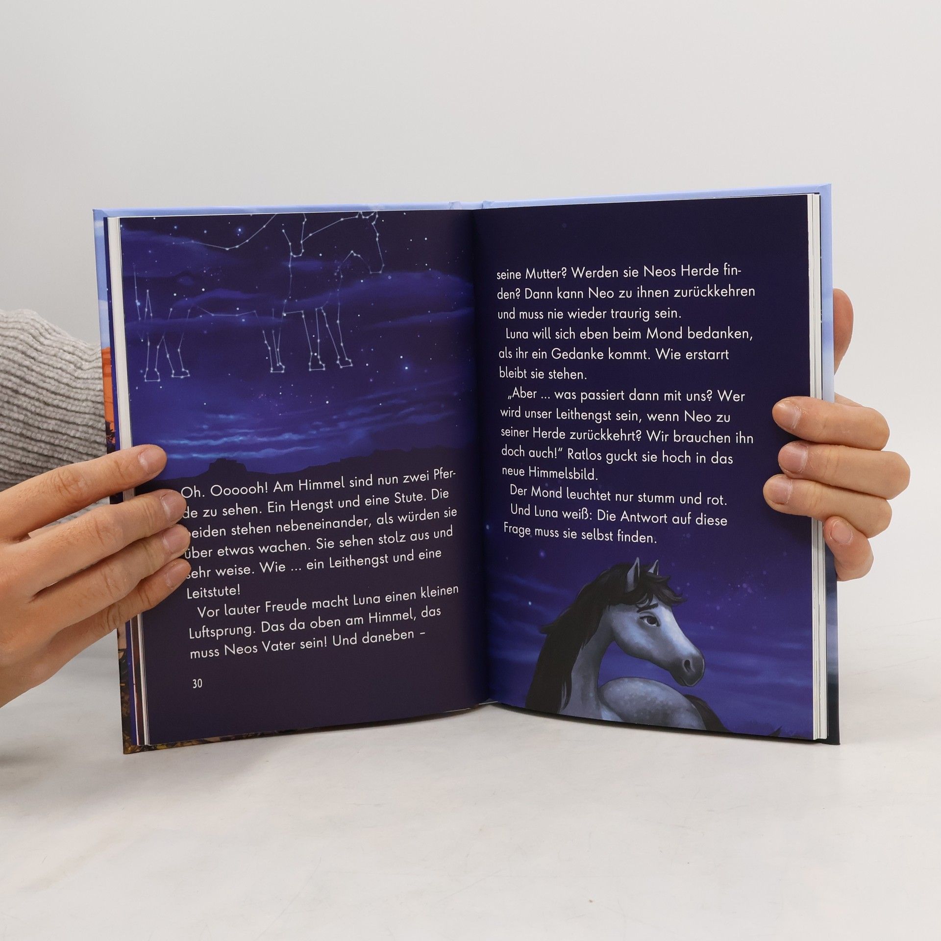 Auf der Suche nach Neos Familie Lunas Herde streift auf der Suche nach Futter durch die Prärie. Da taucht ein Hubschrauber auf. Neo weiß, was das bedeutet: Menschen und somit Gefahr! Er wurde schon einmal durch Menschen von seiner Herde getrennt. Die anderen Wildpferde möchten Neo helfen, seine Familie wiederzufinden. Sie begeben sich auf eine abenteuerliche Reise, auf der Luna zeigen muss, wie mutig sie ist. Wird der Mond ihr auch dieses Mal helfen? Und wird sie ihre Herde beschützen können? Erlebe ein neues spannendes Abenteuer mit Luna! Teil 3 der spannenden Pferde-Reihe Ein Abenteuer aus Sicht der Wildpferde geschrieben das perfekte Geschenk für pferdenärrische Erstleser*innen zum ersten Selberlesen für Kinder ab 7 Jahren großer Lesespaß und schneller Leseerfolg atemberaubende Farbillustrationen auf jeder Doppelseite ausgewogenes Text-Bild-Verhältnis