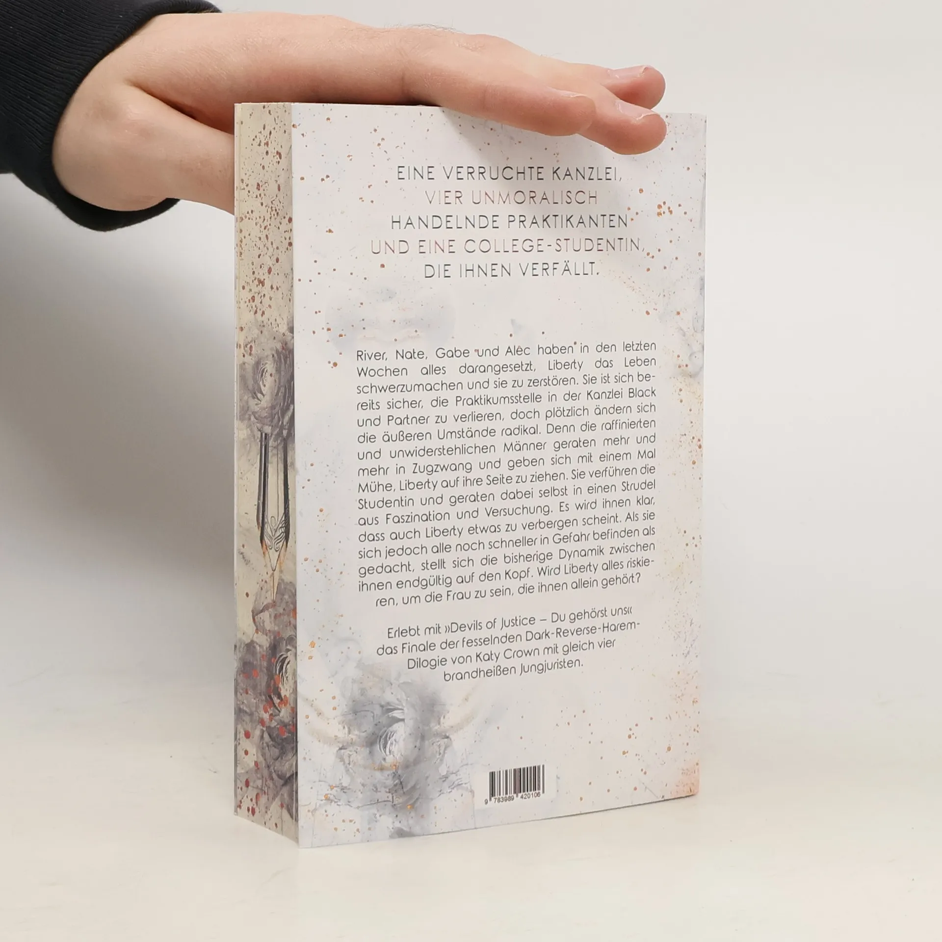 Eine verruchte Kanzlei, vier unmoralisch handelnde Praktikanten und eine College-Studentin, die ihnen verfällt. River, Nate, Gabe und Alec haben in den letzten Wochen alles darangesetzt, Liberty das Leben schwerzumachen und sie zu zerstören. Sie ist sich bereits sicher, die Praktikumsstelle in der Kanzlei Black und Partner zu verlieren, doch plötzlich ändern sich die äußeren Umstände radikal. Denn die raffinierten und unwiderstehlichen Männer geraten mehr und mehr in Zugzwang und geben sich mit einem Mal Mühe, Liberty auf ihre Seite zu ziehen. Sie verführen die Studentin und geraten dabei selbst in einen Strudel aus Faszination und Versuchung. Es wird ihnen klar, dass auch Liberty etwas zu verbergen scheint. Als sie sich jedoch alle noch schneller in Gefahr befinden als gedacht, stellt sich die bisherige Dynamik zwischen ihnen endgültig auf den Kopf. Wird Liberty alles riskieren, um die Frau zu sein, die ihnen allein gehört? Erlebt mit Devils of Justice - Du gehörst uns das Finale der fesselnden Dark-Reverse-Harem-Dilogie von Katy Crown mit gleich vier brandheißen Jungjuristen.