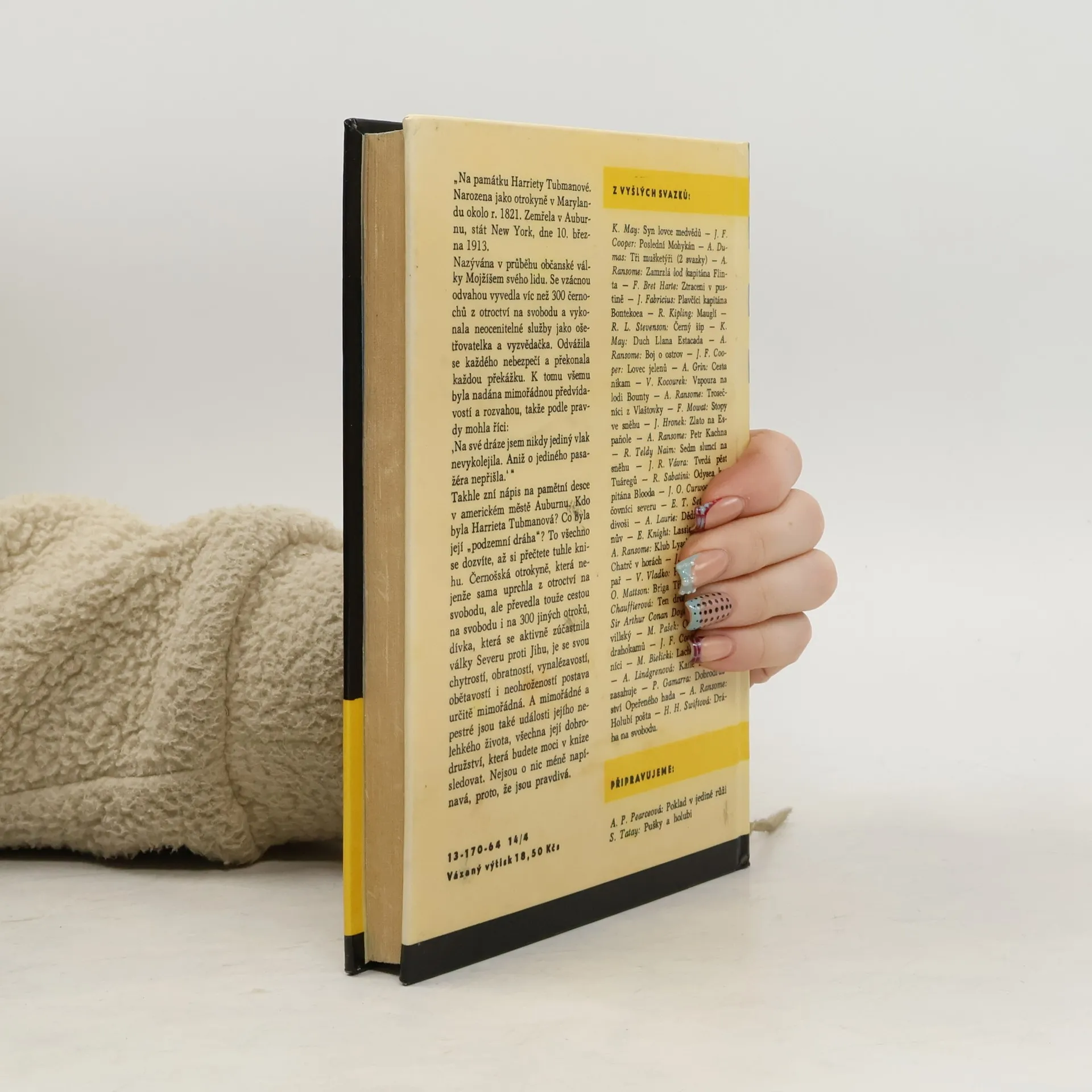Na památku Harriety Tubmanové. Narozena jako otrokyně v Marylandu okolo r. 1821. Zemřela v Auburnu stát New York, dne 10. března 1913. Nazývána v průběhu občanské války Mojžíšem svého lidu. Se vzácnou odvahou vyvedla víc než 300 černochů z otroctví na svobodu a vykonala neocenitelné službyjako ošetřovatelka a vyzvědačka. Odvážila se každého nebezpečí a překonala každou překážku. K tomu všemu byla nadána mimořádnou předvídavostí a rozvahou, takže podle pravdy mohla říci: „Na své dráze jsem nikdy jediný vlak nevykolejila. Aniž o jediného pasažéra nepřišla.“ Takhle zní nápis na pamětní desce v americkém městě Auburnu. Kdo byla Harrieta Tubmanová? Co byla její „podzemní dráha" ? To všechno se dozvíte, až si přečtete tuhle knihu. Černošská otrokyně, která nejenže sama uprchla z otroctví na svobodu, ale převedla stejnou cestou na svobodu i na 300 jiných otroků, dívka, která se aktivně zúčastnila války Severu proti Jihu, je se svou chytrostí, obratností, vynalézavostí, obětavostí i neohrožeností postava určitě mimořádná. A mimořádně a pestré jsou také události jejího nelehkého života, všechna její dobrodružství, která budete moci v knize sledovat. Nejsou o nic méně napínavá, proto, že jsou pravdivá. (V