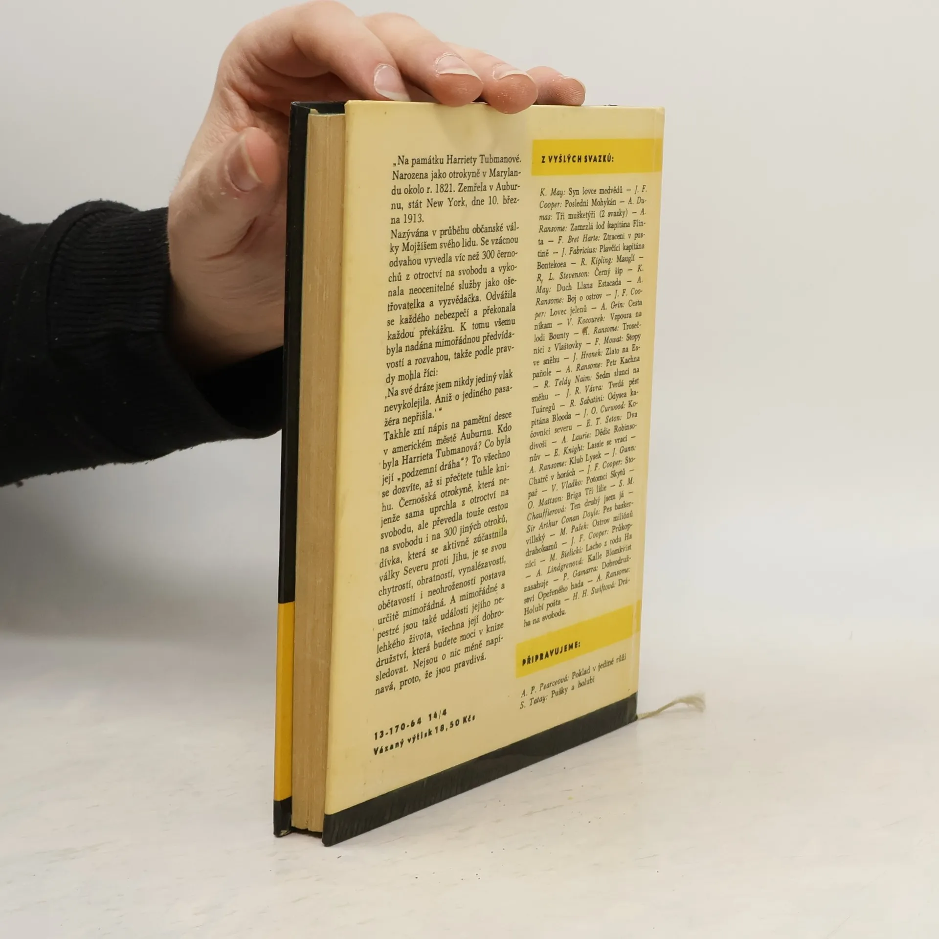 Na památku Harriety Tubmanové. Narozena jako otrokyně v Marylandu okolo r. 1821. Zemřela v Auburnu stát New York, dne 10. března 1913. Nazývána v průběhu občanské války Mojžíšem svého lidu. Se vzácnou odvahou vyvedla víc než 300 černochů z otroctví na svobodu a vykonala neocenitelné službyjako ošetřovatelka a vyzvědačka. Odvážila se každého nebezpečí a překonala každou překážku. K tomu všemu byla nadána mimořádnou předvídavostí a rozvahou, takže podle pravdy mohla říci: „Na své dráze jsem nikdy jediný vlak nevykolejila. Aniž o jediného pasažéra nepřišla.“ Takhle zní nápis na pamětní desce v americkém městě Auburnu. Kdo byla Harrieta Tubmanová? Co byla její „podzemní dráha" ? To všechno se dozvíte, až si přečtete tuhle knihu. Černošská otrokyně, která nejenže sama uprchla z otroctví na svobodu, ale převedla stejnou cestou na svobodu i na 300 jiných otroků, dívka, která se aktivně zúčastnila války Severu proti Jihu, je se svou chytrostí, obratností, vynalézavostí, obětavostí i neohrožeností postava určitě mimořádná. A mimořádně a pestré jsou také události jejího nelehkého života, všechna její dobrodružství, která budete moci v knize sledovat. Nejsou o nic méně napínavá, proto, že jsou pravdivá. (V