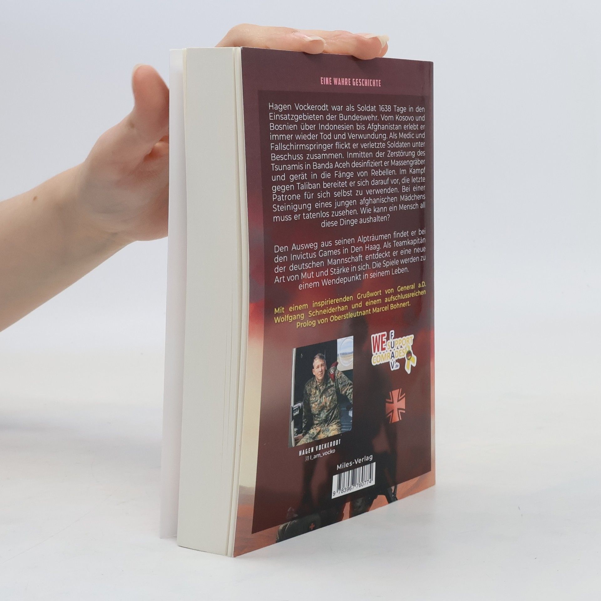 Hagen Vockerodt war als Soldat 1638 Tage in den Einsatzgebieten der Bundeswehr. Vom Kosovo und Bosnien über Thailand bis Afghanistan erlebt er immer wieder Tod und Verwundung. Als Medic und Fallschirmspringer flickt er verletzte Soldaten unter Beschuss zusammen. Inmitten der Zerstörung des Tsunamis in Banda Aceh desinfiziert er Massengräber und gerät in die Fänge von Rebellen. Im Kampf gegen Taliban bereitet er sich darauf vor, die letzte Patrone für sich selbst zu verwenden. Bei einer Steinigung eines jungen afghanischen Mädchens muss er tatenlos zusehen. Wie kann ein Mensch all diese Dinge aushalten? Den Ausweg aus seinen Alpträumen findet er bei den Invictus Games in Den Haag. Als Teamkapitän der deutschen Mannschaft entdeckt er eine neue Art von Mut und Stärke in sich. Die Spiele werden zu einem Wendepunkt in seinem Leben. Mit einem Vorwort von General a.D. Wolfgang Schneiderhan, einem Geleitwort von Brigadegeneral a.D. Michael Bartscher und einem Prolog von Marcel Bohnert.