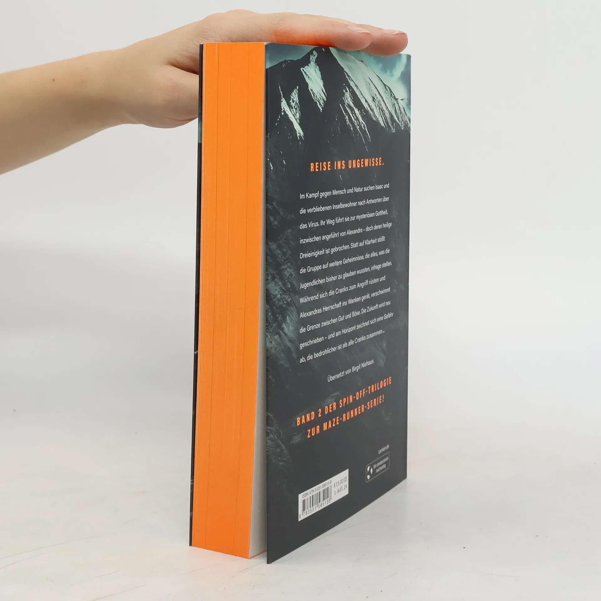 Gefährliche Reise ins Ungewisse Im Kampf gegen Mensch und Natur suchen Isaac und die Inselbewohner nach Antworten. Ihr Weg führt sie zur Gottheit – doch die Dreieinigkeit ist gebrochen. Statt auf Klarheit, stößt die Gruppe auf weitere Geheimnisse, die alles, was die Jugendlichen bisher zu glauben wussten, hinterfragen lassen. Während sich die Cranks zum Angriff rüsten und Alexandras Herrschaft ein vorschnelles Ende nimmt, verschwimmt die Grenze zwischen Gut und Böse. Die Zukunft wird neu geschrieben – und am Horizont zeichnet sich eine Gefahr ab, die bedrohlicher ist als alle Cranks zusammen. Band 2 der Spin-off-Trilogie zur MAZE-RUNNER-SERIE!