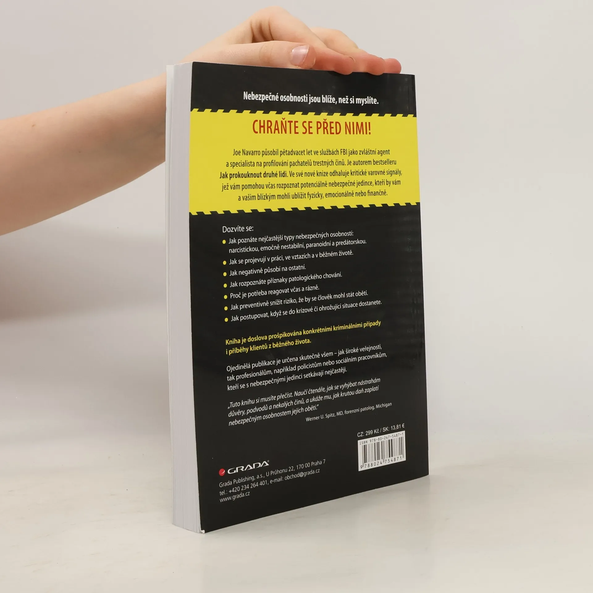 Jak je odhalit a chránit se před nimi. Jak rozpoznat nebezpečné osobnosti kolem nás? Autor, bývalý agent FBI, ve své knize přibližuje nejčastější typy nebezpečných osobností — narcistickou, emočně nevyrovnanou, paranoidní a predátorskou — a ukazuje, jak včas zareagovat. Nebezpečné osobnosti jsou blíže, než si myslíte. Chraňte se před nimi!