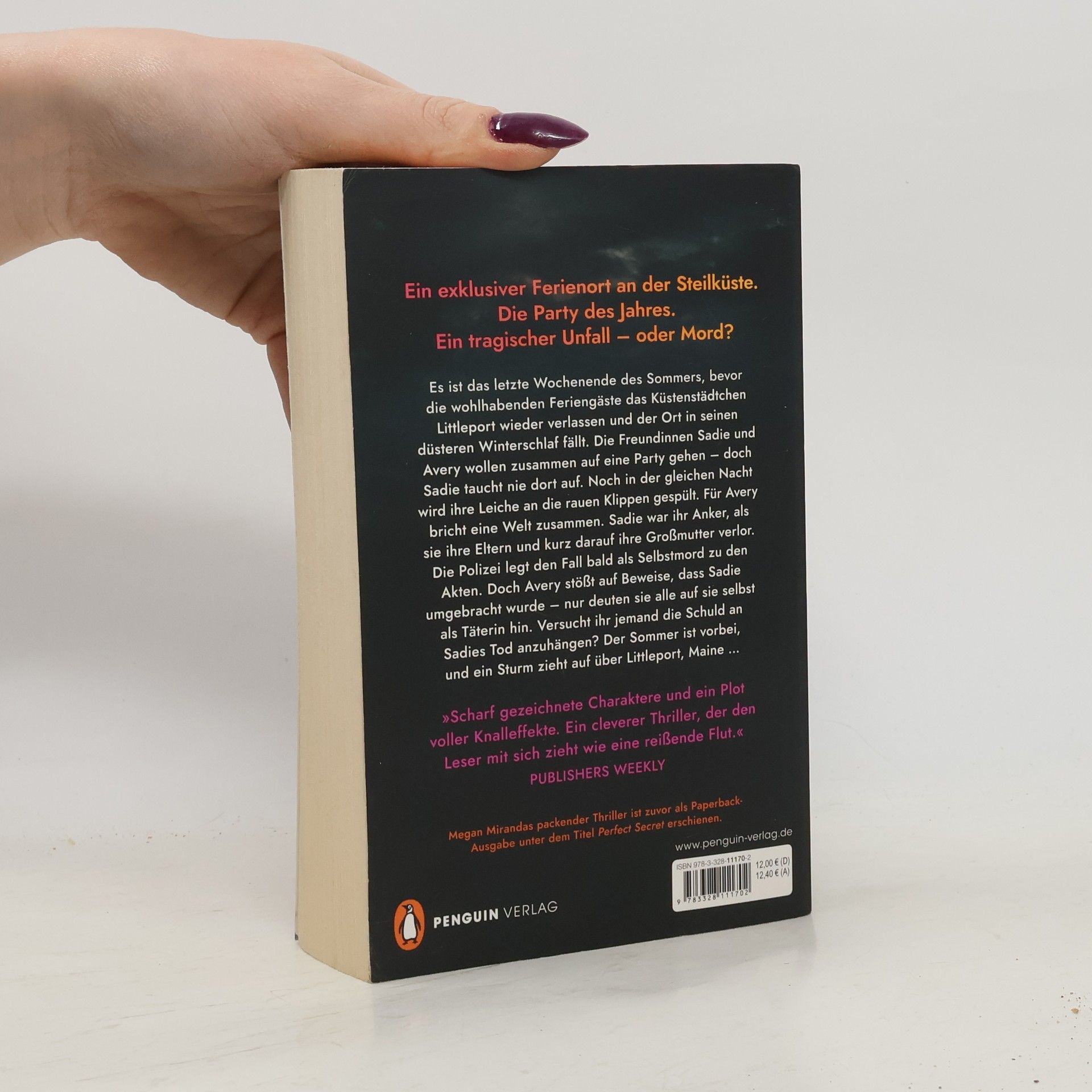 Thriller-Hochspannung vom Allerfeinsten: ein weiterer atemloser Bestseller von Megan Miranda! Ein idyllischer Ferienort am Meer. Der letzte Abend des Sommers. Ein lebloser Körper am Fuß der Klippen … Es ist das letzte Wochenende des Sommers, bevor die wohlhabenden Feriengäste das Küstenstädtchen Littleport wieder verlassen und der Ort in seinen düsteren Winterschlaf fällt. Die Freundinnen Sadie und Avery wollen zusammen auf eine Party gehen – doch Sadie taucht nie dort auf. Noch in der gleichen Nacht wird ihre Leiche an die rauen Klippen gespült. Für Avery bricht eine Welt zusammen. Sadie war ihr Anker, als sie ihre Eltern und kurz darauf ihre Großmutter verlor. Die Polizei legt den Fall bald als Selbstmord zu den Akten. Doch Avery stößt auf Beweise, dass Sadie umgebracht wurde – nur deuten sie alle auf sie selbst als Täterin hin. Versucht ihr jemand die Schuld an Sadies Tod anzuhängen? Der Sommer ist vorbei, und ein Sturm zieht auf über Littleport, Maine … »Der ultimative Thriller! Spannung bis zur letzten Seite.« Reese Witherspoon (»Reese's Book Club«) Megan Mirandas packender Thriller »Das Sommerhaus« ist zuvor im Paperback unter dem Titel »Perfect Secret« erschienen.