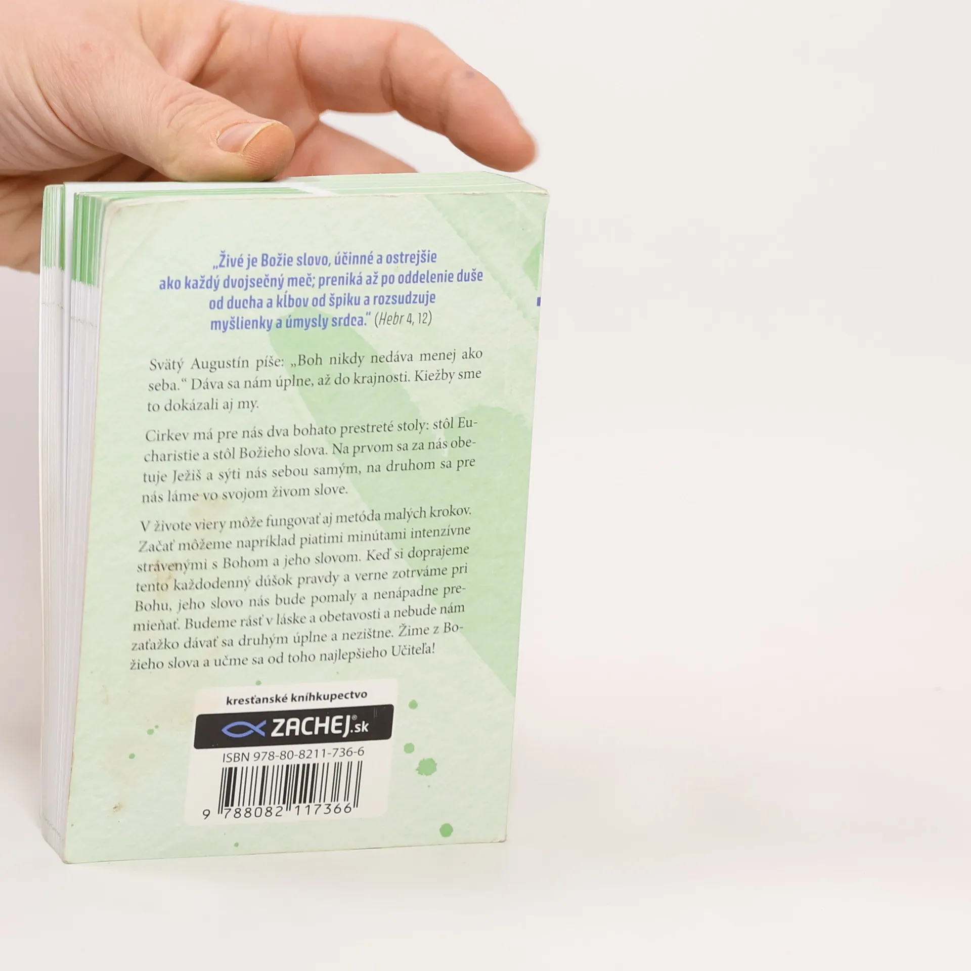 „Živé je Božie slovo, účinné a ostrejšie ako každý dvojsečný meč; preniká až po oddelenie duše od ducha a kĺbov od špiku a rozsudzuje myšlienky a úmysly srdca.“ (Hebr 4, 12) Svätý Augustín píše: „Boh nikdy nedáva menej ako seba.“ Dáva sa nám úplne, až do krajnosti. Kiežby sme to dokázali aj my. Cirkev má pre nás dva bohato prestreté stoly: stôl Eucharistie a stôl Božieho slova. Na prvom sa za nás obetuje Ježiš a sýti nás sebou samým, na druhom sa pre nás láme vo svojom živom slove. V živote viery môže fungovať aj metóda malých krokov. Začať môžeme napríklad piatimi minútami intenzívne strávenými s Bohom a jeho slovom. Keď si doprajeme tento každodenný dúšok pravdy a verne zotrváme pri Bohu, jeho slovo nás bude pomaly a nenápadne premieňať. Budeme rásť v láske a obetavosti a nebude nám zaťažko dávať sa druhým úplne a nezištne. Žime z Božieho slova a učme sa od toho najlepšieho Učiteľa! Kniha je cirkevne schválená.