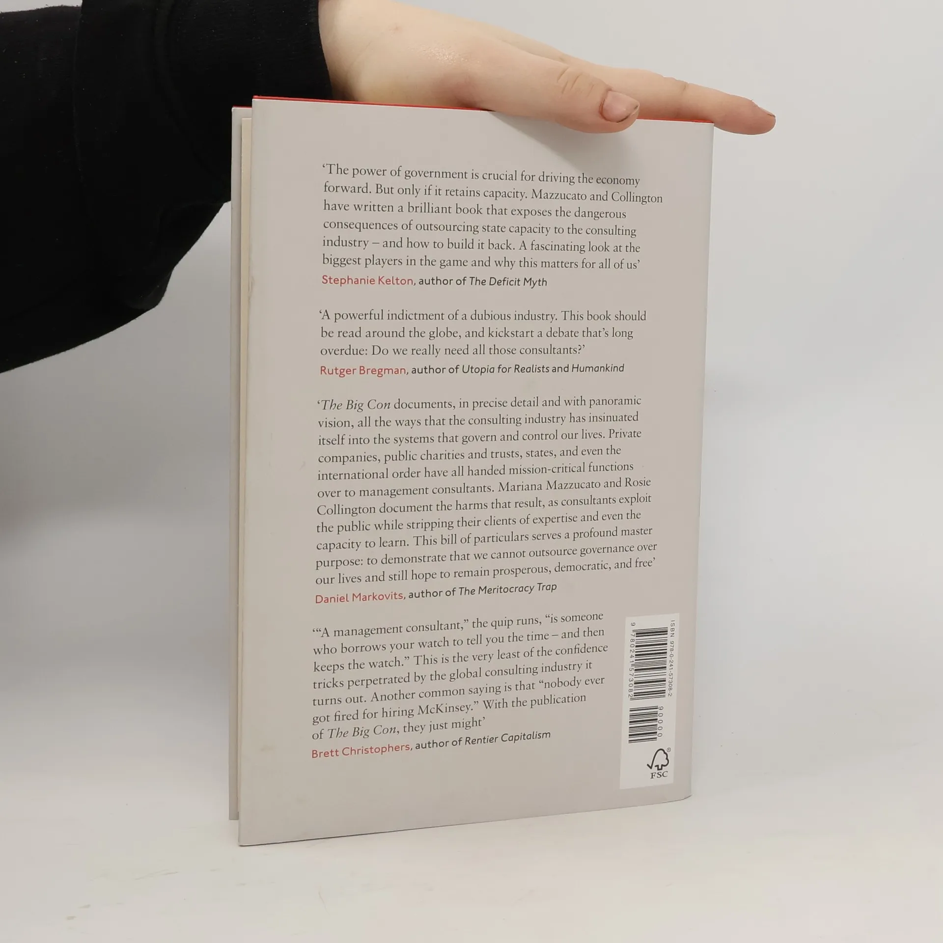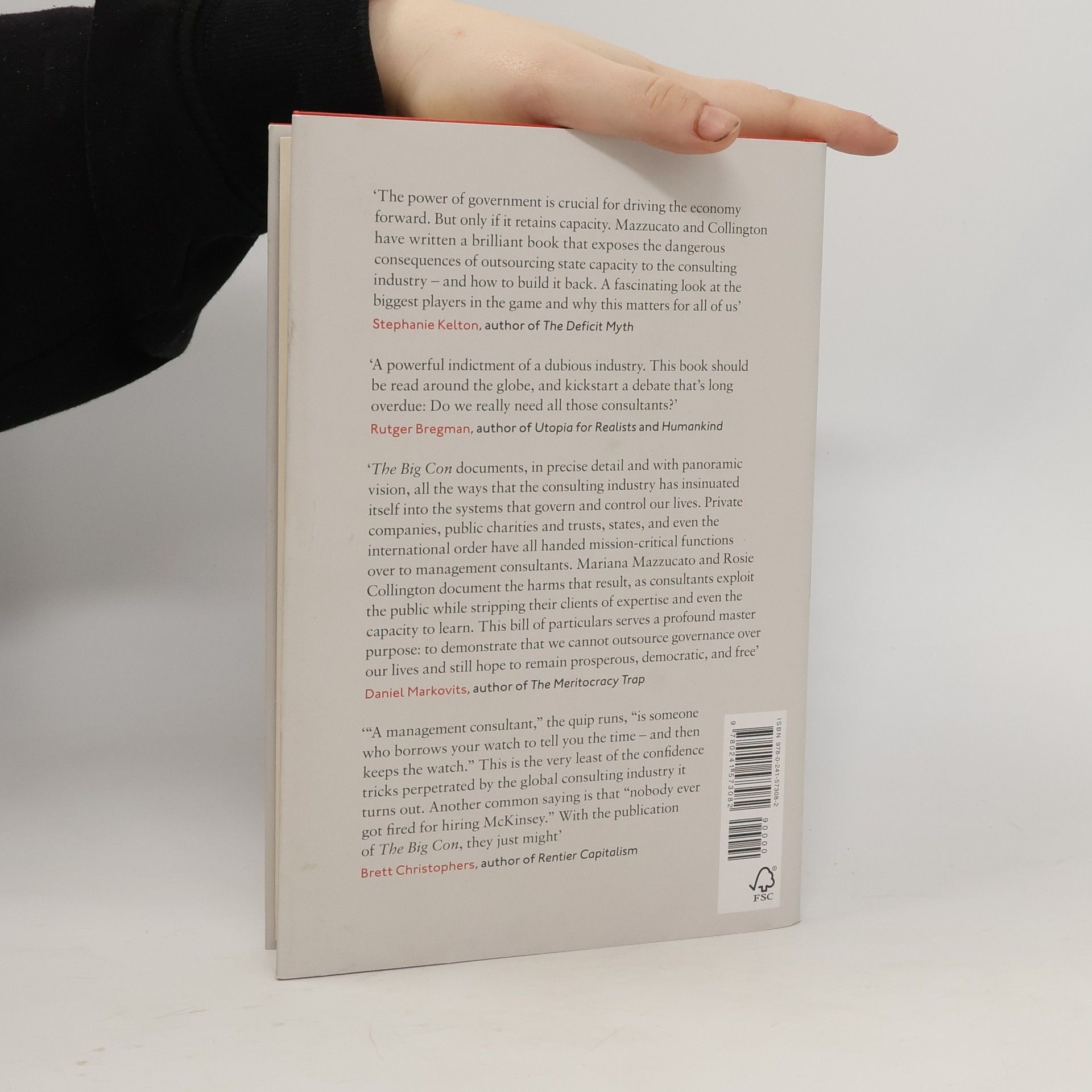 There is an entrenched relationship between the consulting industry and hollowed-out, risk-averse governments and shareholder value-maximizing firms. Mariana Mazzucato and Rosie Collington show that our economies' reliance on companies such as McKinsey, Boston Consulting Group, Bain & Company, PwC, Deloitte, KPMG and EY stunts innovation, obfuscates corporate and political accountability and impedes our collective mission of halting climate breakdown. The 'Big Con' is possible in today's economies because of the unique power that consultancies wield through extensive contracts and networks - as advisors, legitimators and outsourcers - and the illusion that they are objective sources of expertise and capacity. The Big Con weakens our businesses, infantilizes our governments and warps our economies. Mazzucato and Collington expertly debunk the myth that consultancies always add value to the economy. With a wealth of original research, they argue brilliantly for investment and collective intelligence within all organizations and communities, and for a new system in which public and private sectors work innovatively for the common good. We must recalibrate the role of consultants and rebuild economies and governments that are fit for purpose.