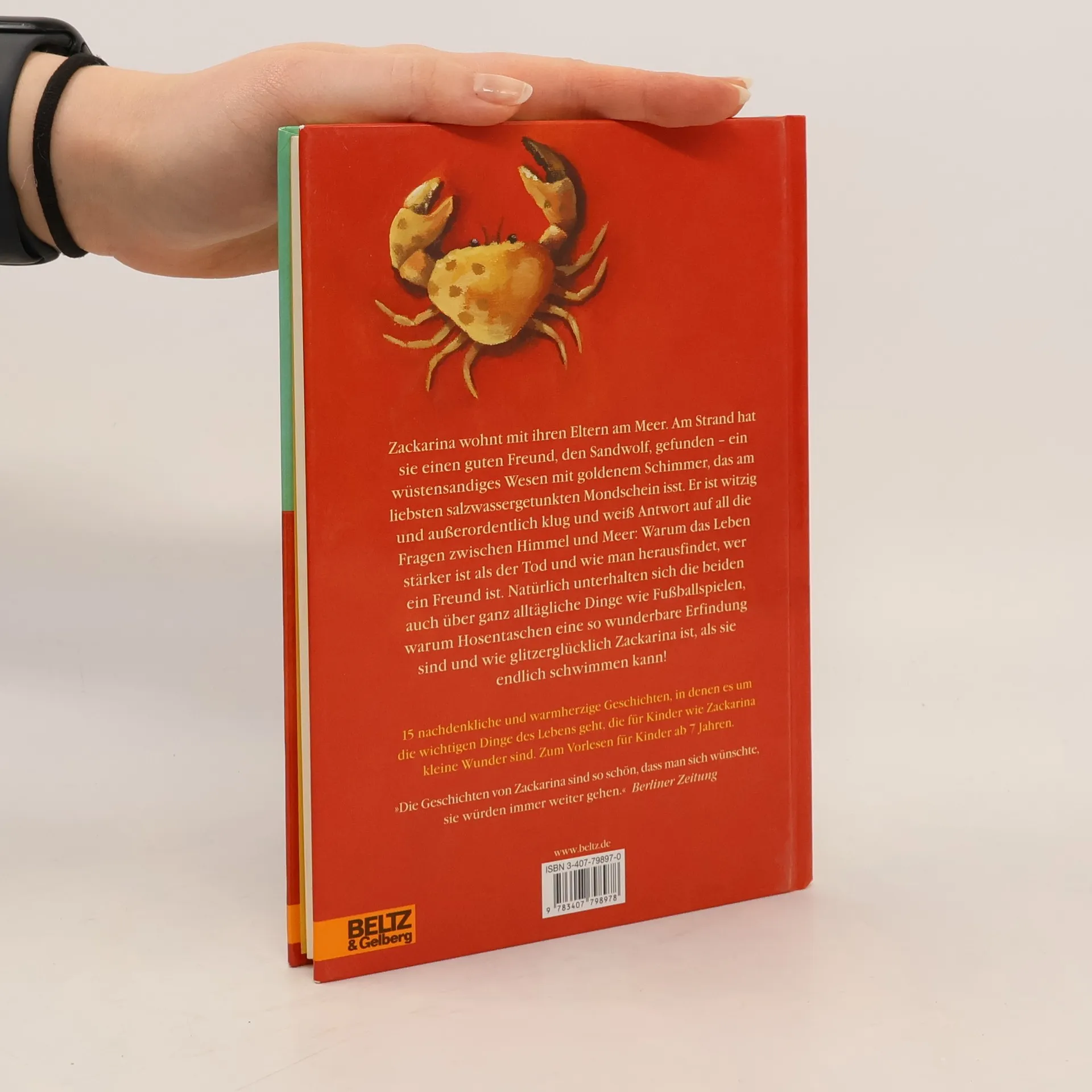 Zackarina, das kleine Mädchen, wohnt mit ihren Eltern am Meer. Beim Buddeln im Sand hat sie den Sandwolf entdeckt, ein wüstensandiges Wesen mit goldenem Schimmer, das am liebsten salzwassergetunkten Mondschein isst. Der Sandwolf ist witzig, charmant und außerordentlich klug. Er weiß Antwort auf all die Fragen zwischen Himmel und Meer: Warum man alle Erinnerungen aufheben sollte (und nicht nur die glücklichen) und warum das Leben stärker ist als der Tod, wie man herausfindet, wer ein Freund ist, und weshalb Menschen wenigstens in zwei Dingen gut sind: im Denken und im Sprechen. Aber natürlich unterhalten sich die beiden auch über ganz alltägliche Dinge wie Fußball, Kaninchen und Mäuse oder das Feuer, das im Drachen wohnt. Warum Hosentaschen eine so wunderbare Erfindung sind und wie glitzerglücklich Zackarina ist, als sie endlich schwimmen kann! 15 nachdenkliche und warmherzige Geschichten, in denen es um die wichtigen Dinge des Lebens geht, um Alltäglichkeiten, die für Kinder manchmal noch kleine Wunder sind.