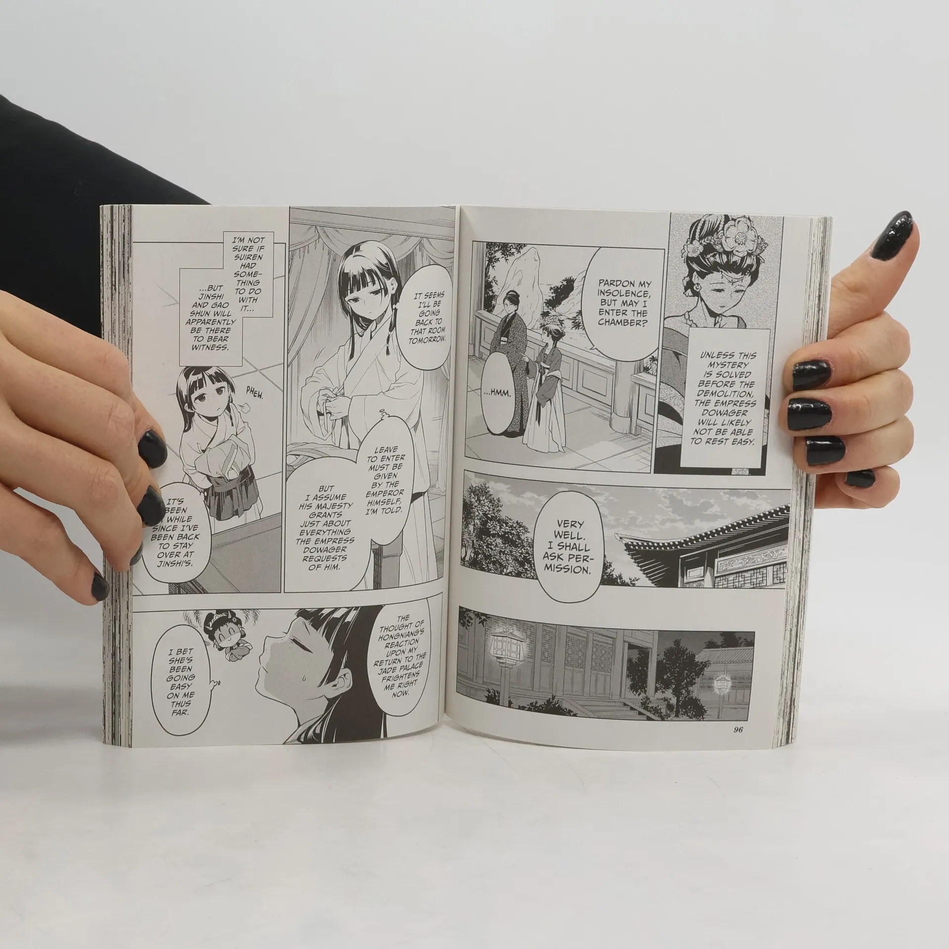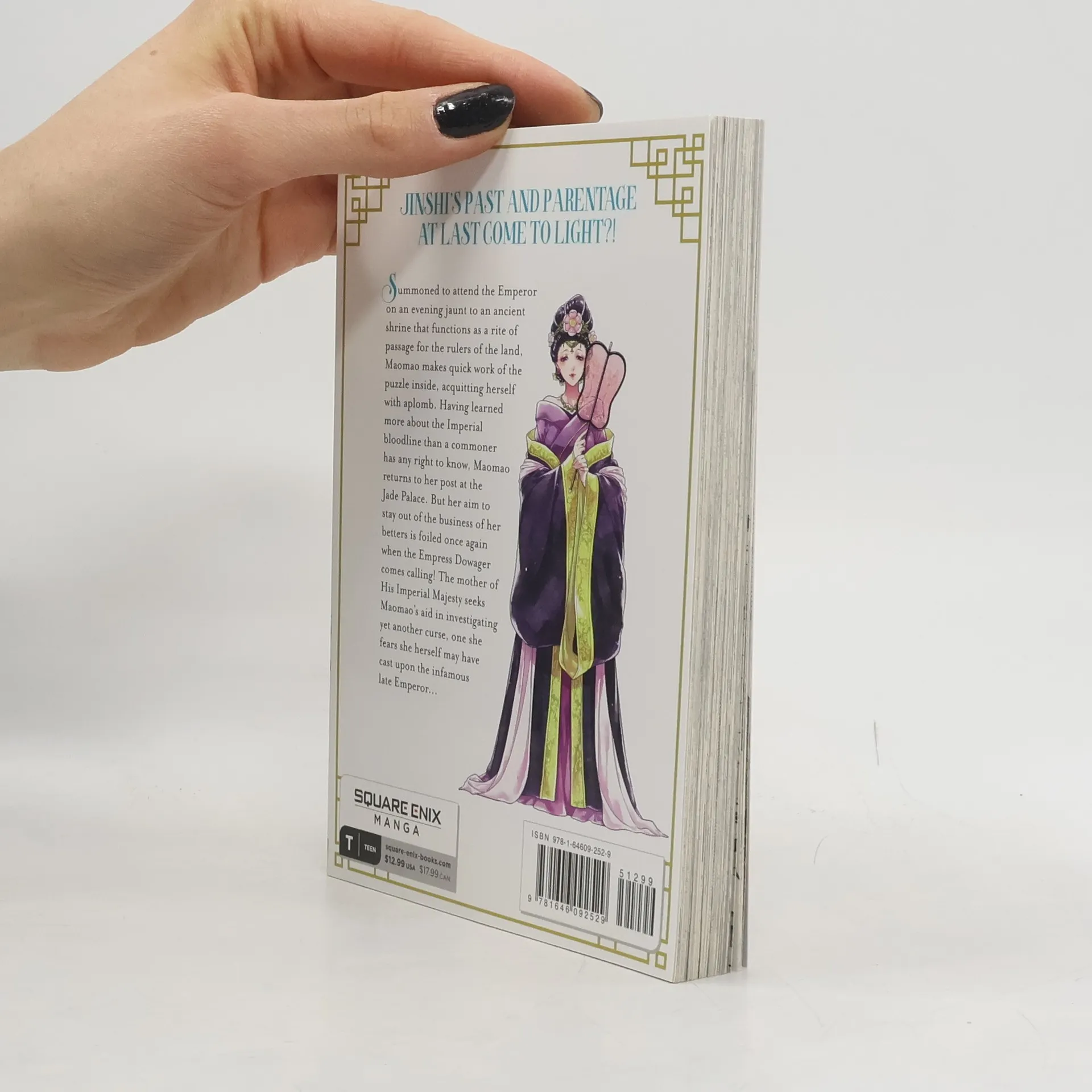 After breaking a "curse" on the imperial heirs, a palace servant with training in herbal medicine is promoted up the ranks to food taster...and right into the thick of palace intrigue in this lushly illustrated historical mystery series! Having figured out the trick to navigating the corridors of the ancient mausoleum found within the Inner Court, Maomao does an admirable job solving the current mystery in front of the emperor and Jinshi. And then the Empress Dowager comes to Maomao, asking her to investigate the late Emperor's curse. Jinshi's past and parentage are revealed!